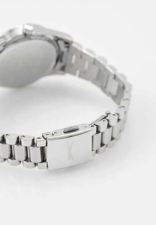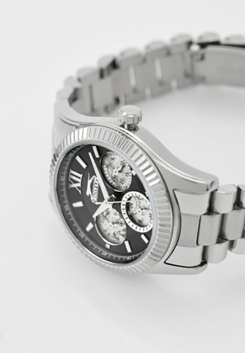 Женские кварцевые часы Slazenger SL.09.2317.4.02 — это выразительный и функциональный аксессуар, сочетающий стиль, прочность и насыщенную комплектацию. Корпус и браслет выполнены из суперметалла. Циферблат чёрного цвета защищён минеральным стекломМинеральное стеклоМинеральное стекло представляет собой искусственно выращенный минерал кварца. Такое стекло отличается особой устойчивостью к повреждениям и царапинам. Уступает по некоторым качествам сапфировому стеклу. и оформлен с вынесенными малыми циферблатами для индикации дня недели, даты и времени в 24-часовом формате. Стрелки и метки оснащены люминесцентным покрытиемЛюминесцентное покрытиеПозволяет считывать показания времени в темноте. Производители наносят на стрелки, часовые индексы, безель или поверхность циферблата светонакопительный состав, дающий холодное свечение., обеспечивающим хорошую читаемость в темноте. Браслет из суперметалла фиксируется на раскладной застёжкеРаскладная застёжкаТакой тип застёжки используется только на браслетах из металла. Она никогда не раскрывается полностью, происходит разделение на 2 и более частей. Раскладывающая застёжка снизит вероятность потери часов к минимуму., обеспечивая удобство и надёжность ношения. Водонепроницаемость 30 м позволяет использовать часы в повседневных условиях, защищая от случайных брызг и капель дождя. Модель подчёркивает индивидуальность владельца и идеально подходит как для повседневного, так и для торжественного образа.