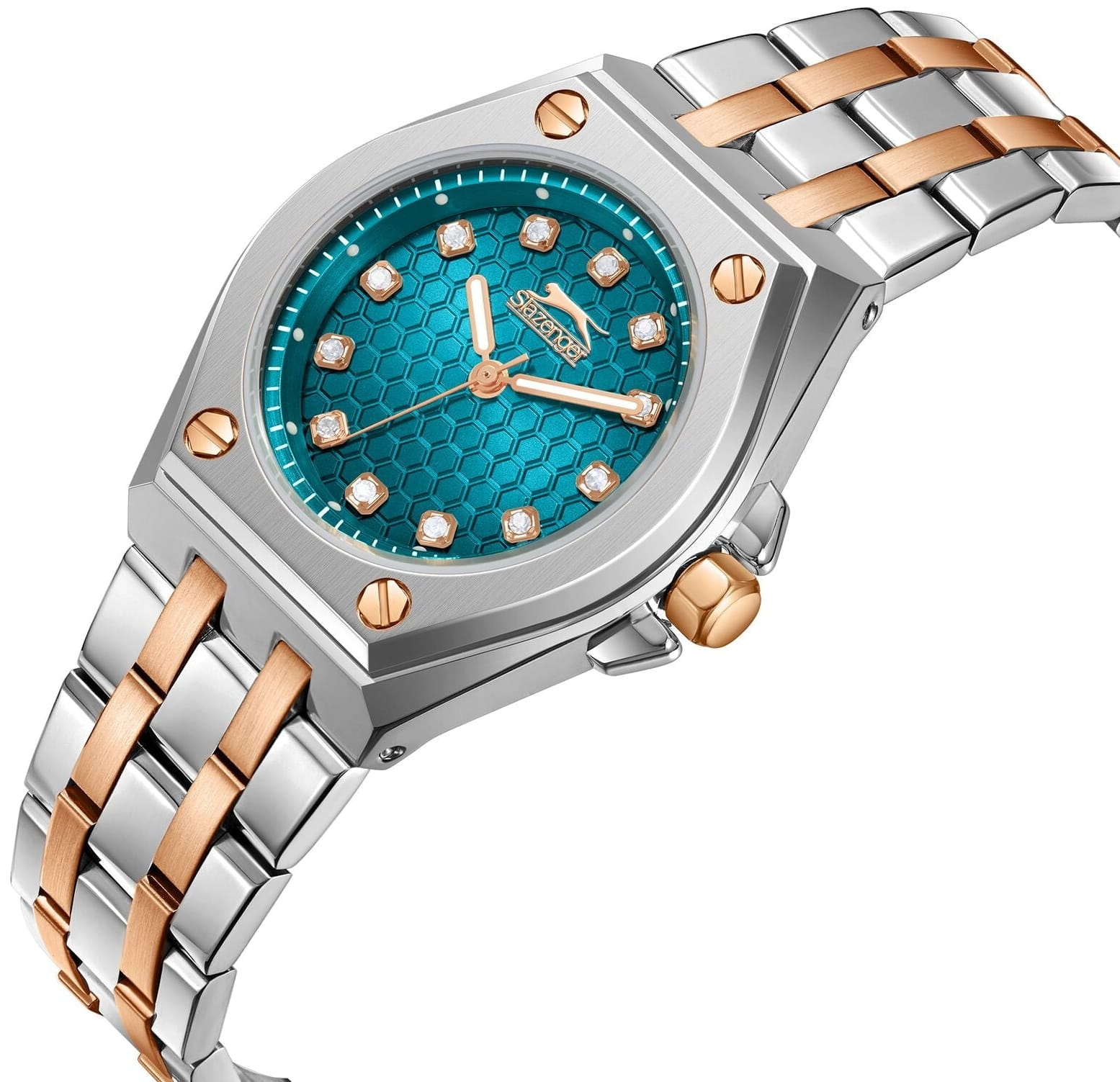 Женские часы Slazenger SL.09.2342.3.05 – это сочетание элегантности, современного стиля и надёжности. Изящный корпус из суперметалла подчёркивает утончённость модели, а благородное цветовое исполнение делает их идеальным аксессуаром для любой ситуации – будь то деловая встреча, романтический вечер или повседневные выходы. Циферблат украшен кристаллами. Циферблат надёжно защищён минеральным стекломМинеральное стеклоМинеральное стекло представляет собой искусственно выращенный минерал кварца. Такое стекло отличается особой устойчивостью к повреждениям и царапинам. Уступает по некоторым качествам сапфировому стеклу., которое устойчиво к механическим повреждениям и сохраняет кристальную прозрачность. Стрелки с люминесцентным покрытиемЛюминесцентное покрытиеПозволяет считывать показания времени в темноте. Производители наносят на стрелки, часовые индексы, безель или поверхность циферблата светонакопительный состав, дающий холодное свечение. мягко подсвечиваются в темноте, обеспечивая комфортное считывание времени в любое время суток. Эргономичный браслет из суперметалла с PVD-покрытияPVDУльтратонкое покрытие наносится в технике вакуумного напыления, сочетает в себе нитрид титана особой прочности со слоем золота или оксида хрома. Несёт в себе декоративную или защитную функцию. удобно облегает запястье и фиксируется с помощью раскладной застёжкиРаскладная застёжкаТакой тип застёжки используется только на браслетах из металла. Она никогда не раскрывается полностью, происходит разделение на 2 и более частей. Раскладывающая застёжка снизит вероятность потери часов к минимуму., обеспечивая надёжность и комфорт в повседневном ношении. Утончённый стиль, внимание к деталям и практичность делают эту модель идеальным выбором для современных женщин, ценящих эстетику и функциональность.