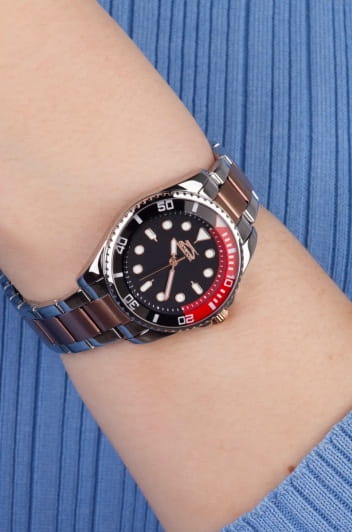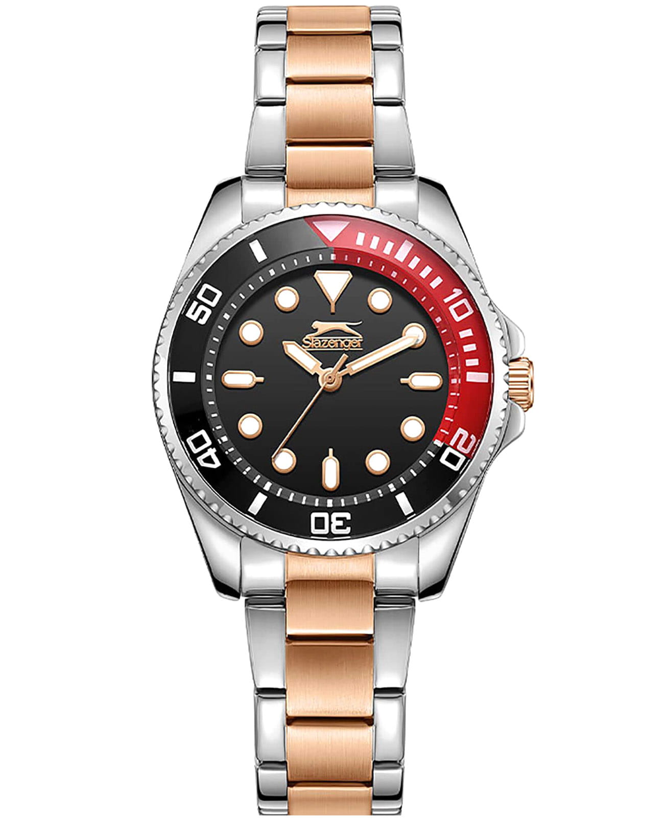 Женские кварцевые часы Slazenger SL.09.2353.3.03 – это сочетание элегантности, современного стиля и надёжности. Изящный корпус из суперметалла серебристого цвета, диаметром 32 мм и толщиной 10 мм, подчёркивает утончённость модели и делает их идеальным аксессуаром для любой ситуации – будь то деловая встреча, романтический вечер или повседневные выходы. Циферблат надёжно защищён минеральным стекломМинеральное стеклоМинеральное стекло представляет собой искусственно выращенный минерал кварца. Такое стекло отличается особой устойчивостью к повреждениям и царапинам. Уступает по некоторым качествам сапфировому стеклу., которое устойчиво к механическим повреждениям и сохраняет кристальную прозрачность. Браслет из суперметалла с частичным IP-покрытиемIP-покрытиеМетод ионного напыления. Демонстрирует повышенную устойчивость к истиранию, окислению и химическим веществам. Под воздействием высокого давления и температуры около 1500°C молекулы металла надёжно соединяются с частицами корпуса часов. цвета розового золота удобно облегает запястье и фиксируется с помощью раскладной застёжкиРаскладная застёжкаТакой тип застёжки используется только на браслетах из металла. Она никогда не раскрывается полностью, происходит разделение на 2 и более частей. Раскладывающая застёжка снизит вероятность потери часов к минимуму., обеспечивая надёжность и комфорт в повседневном ношении. Утончённый стиль, внимание к деталям и практичность делают эту модель идеальным выбором для современных женщин, ценящих эстетику и функциональность. Поворотный безельБезельВнешний ободок, закрепляющий стекло. В спортивных часах так называется поворотное кольцо с делениями на циферблате, выполняет роль таймера – замеряет отрезки времени на шкале. Неподвижный безель – элемент декора. Однонаправленно вращающийся безель на дайверских часах позволяет фиксировать моменты погружения и выныривания на поверхность. с IP-покрытиемIP-покрытиеМетод ионного напыления. Демонстрирует повышенную устойчивость к истиранию, окислению и химическим веществам. Под воздействием высокого давления и температуры около 1500°C молекулы металла надёжно соединяются с частицами корпуса часов.. Стрелки и метки покрыты люминесцентным покрытиемЛюминесцентное покрытиеПозволяет считывать показания времени в темноте. Производители наносят на стрелки, часовые индексы, безель или поверхность циферблата светонакопительный состав, дающий холодное свечение., обеспечивающим отличную читаемость в темноте. Водозащита до 30 метров позволит защитить корпус от случайных брызг или капель дождя.