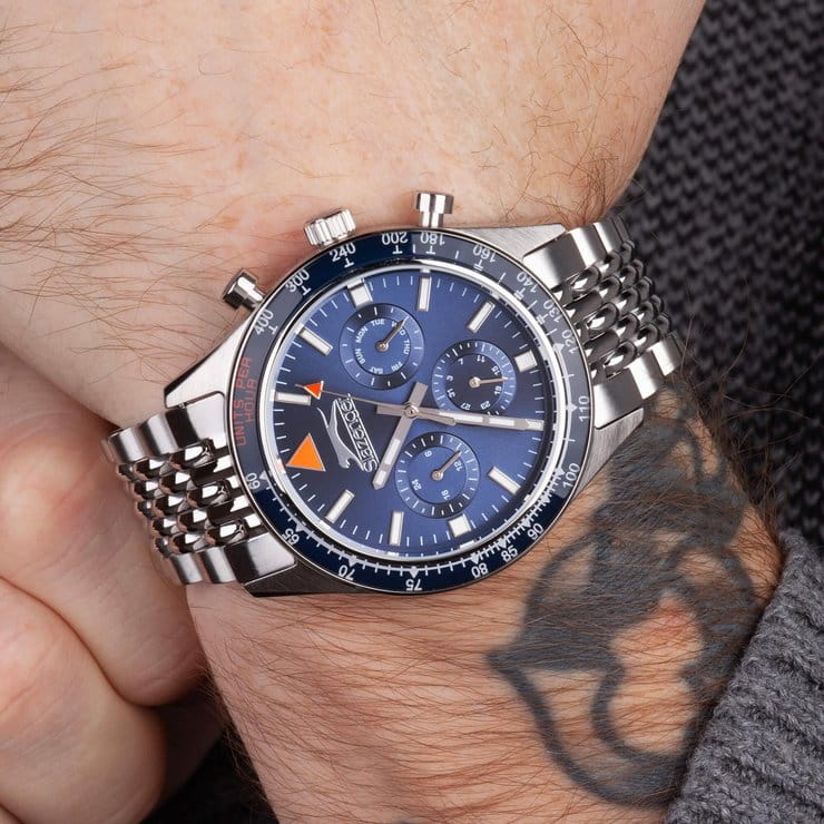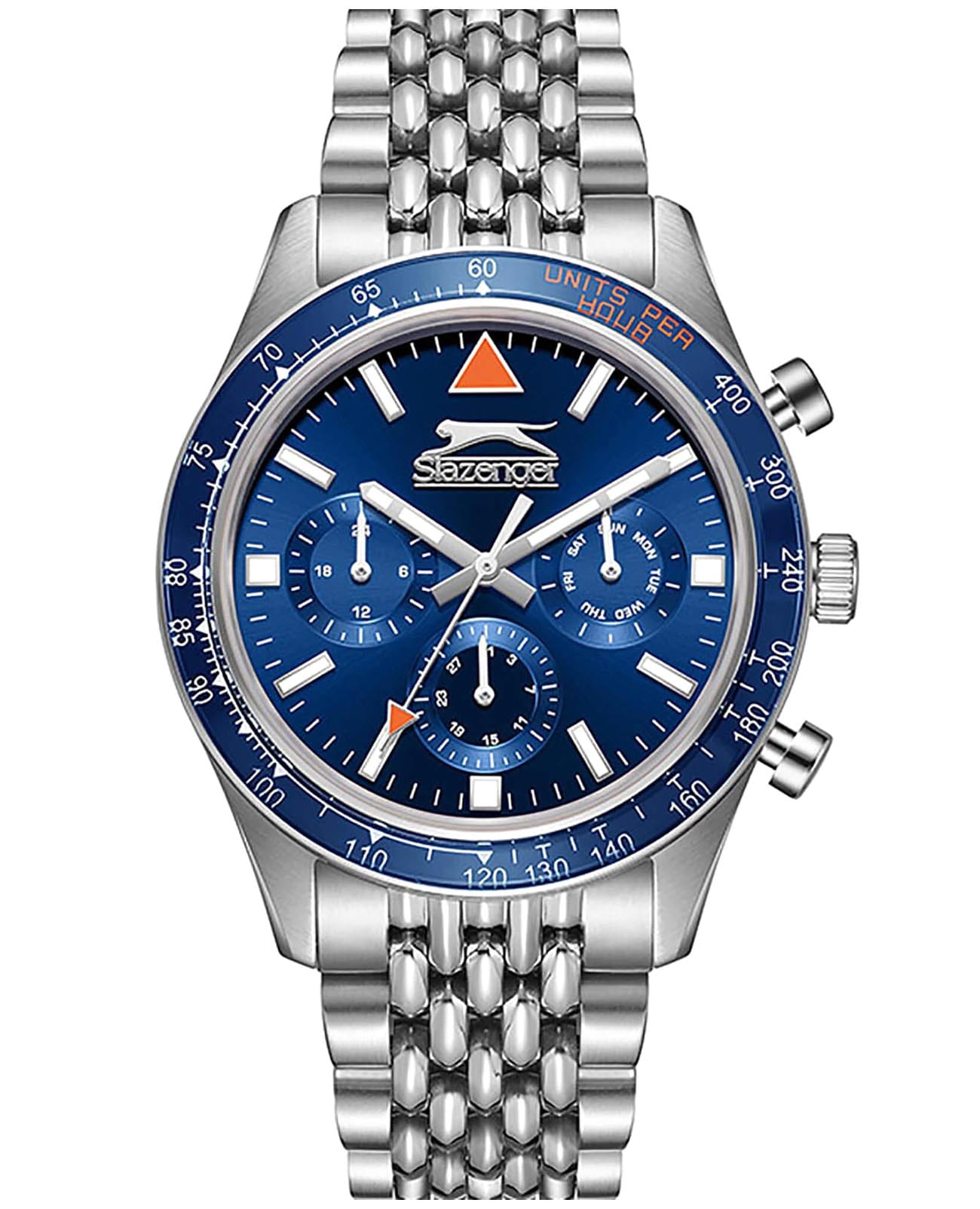 Мужские кварцевые часы Slazenger SL.09.2360.2.03 – идеальное сочетание классического дизайна и современных технологий, созданное для уверенных в себе мужчин. Корпус выполнен из суперметалла серебристого цвета, диаметром 43 мм и толщиной 12 мм, подчёркивает надежность модели и делает их идеальным аксессуаром для любой ситуации – будь то деловая встреча или повседневные выходы. Циферблат надёжно защищён минеральным стекломМинеральное стеклоМинеральное стекло представляет собой искусственно выращенный минерал кварца. Такое стекло отличается особой устойчивостью к повреждениям и царапинам. Уступает по некоторым качествам сапфировому стеклу., которое устойчиво к механическим повреждениям и сохраняет кристальную прозрачность. Неподвижный безельБезельВнешний ободок, закрепляющий стекло. В спортивных часах так называется поворотное кольцо с делениями на циферблате, выполняет роль таймера – замеряет отрезки времени на шкале. Неподвижный безель – элемент декора. Однонаправленно вращающийся безель на дайверских часах позволяет фиксировать моменты погружения и выныривания на поверхность. с IP-покрытиемIP-покрытиеМетод ионного напыления. Демонстрирует повышенную устойчивость к истиранию, окислению и химическим веществам. Под воздействием высокого давления и температуры около 1500°C молекулы металла надёжно соединяются с частицами корпуса часов. синего цвета. Стальной браслет на раскладной застёжкеРаскладная застёжкаТакой тип застёжки используется только на браслетах из металла. Она никогда не раскрывается полностью, происходит разделение на 2 и более частей. Раскладывающая застёжка снизит вероятность потери часов к минимуму. удобно облегает запястье, обеспечивая надёжность и комфорт в повседневном ношении. Стрелки и метки покрыты люминесцентным покрытиемЛюминесцентное покрытиеПозволяет считывать показания времени в темноте. Производители наносят на стрелки, часовые индексы, безель или поверхность циферблата светонакопительный состав, дающий холодное свечение., обеспечивающим отличную читаемость в темноте. Эти часы станут не просто аксессуаром, а надежным спутником в любой ситуации, подчеркивая ваш безупречный вкус и деловой стиль. Вынесенный циферблат с 24-х часовым указателем времени и функция тахиметраТахиметрРазмеченная шкала, располагается на ободке или безеле часов. Тахиметр позволяет рассчитать скорость на определённом участке пути, расстояние измеряется в километрах или милях.. Водозащита 50 метров позволит защитить корпус от случайных брызг или капель дождя.