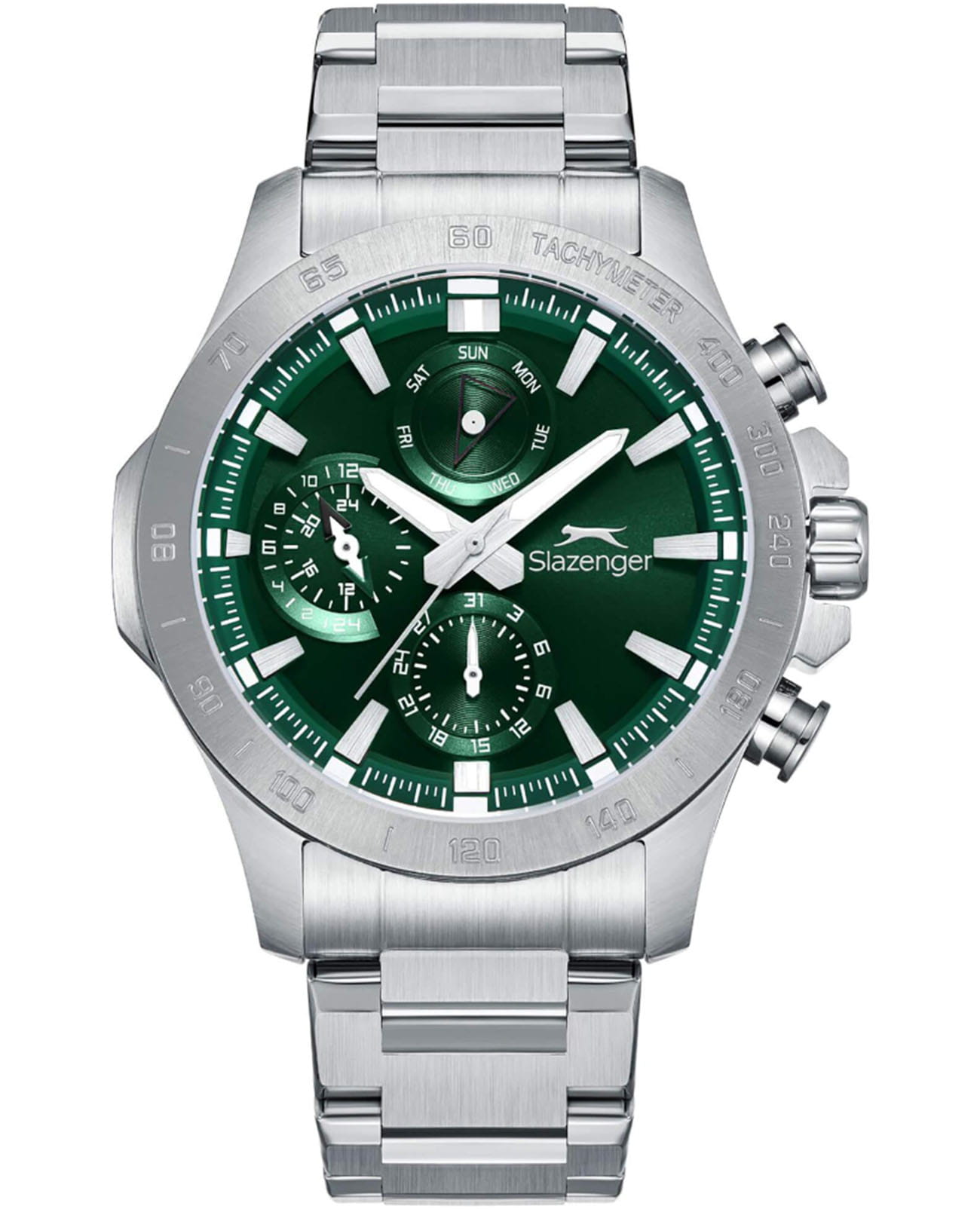 Мужские кварцевые часы Slazenger — это выразительный и функциональный аксессуар. Корпус диаметром 44 мм и толщиной 12 мм выполнен из нержавеющей стали 316L. Циферблат зелёного цвета оформлен индексами и стрелками. Циферблат защищён минеральным стекломМинеральное стеклоМинеральное стекло представляет собой искусственно выращенный минерал кварца. Такое стекло отличается особой устойчивостью к повреждениям и царапинам. Уступает по некоторым качествам сапфировому стеклу.. Механизм — кварцевый. Часы оснащены индикацией дня недели, даты и 12/24-часового формата времени. Стрелки и метки с люминесцентным покрытиемЛюминесцентное покрытиеПозволяет считывать показания времени в темноте. Производители наносят на стрелки, часовые индексы, безель или поверхность циферблата светонакопительный состав, дающий холодное свечение., обеспечивающим хорошую читаемость в темноте. Часы оснащены стальным браслетом с раскладной застёжкойРаскладная застёжкаТакой тип застёжки используется только на браслетах из металла. Она никогда не раскрывается полностью, происходит разделение на 2 и более частей. Раскладывающая застёжка снизит вероятность потери часов к минимуму.. Водонепроницаемость 100 м позволяет использовать часы для плавания и повседневного ношения. Гарантия — 12 месяцев. Идеальный выбор для тех, кто ценит стиль, функциональность и качество.