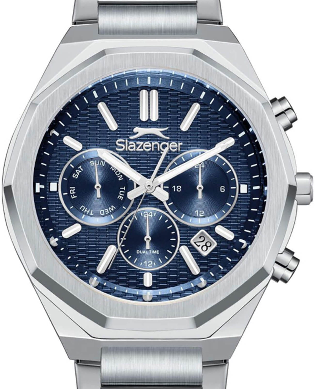 Мужские кварцевые часы Slazenger — это выразительный и функциональный аксессуар. Корпус диаметром 42 мм и толщиной 12,5 мм выполнен из нержавеющей стали 316L. Циферблат синего цвета оформлен индексами и стрелками. Окошко даты расположено между 4 и 5 часами. Указатель дня недели и 24-часовой формат времени вынесены на отдельные субциферблаты. Циферблат защищён минеральным стекломМинеральное стеклоМинеральное стекло представляет собой искусственно выращенный минерал кварца. Такое стекло отличается особой устойчивостью к повреждениям и царапинам. Уступает по некоторым качествам сапфировому стеклу.. Механизм — кварцевый калибр JP25. Часы оснащены функцией второго часового пояса (GMT)Второй часовой поясФункция, позволяющая отображать время двух часовых поясов одновременно.. Стрелки и метки с люминесцентным покрытиемЛюминесцентное покрытиеПозволяет считывать показания времени в темноте. Производители наносят на стрелки, часовые индексы, безель или поверхность циферблата светонакопительный состав, дающий холодное свечение., обеспечивающим хорошую читаемость в темноте. Часы оснащены стальным браслетом с раскладной застёжкойРаскладная застёжкаТакой тип застёжки используется только на браслетах из металла. Она никогда не раскрывается полностью, происходит разделение на 2 и более частей. Раскладывающая застёжка снизит вероятность потери часов к минимуму.. Водонепроницаемость 100 м позволяет использовать часы для плавания и повседневного ношения. Гарантия — 12 месяцев. Идеальный выбор для тех, кто ценит стиль, функциональность и качество.