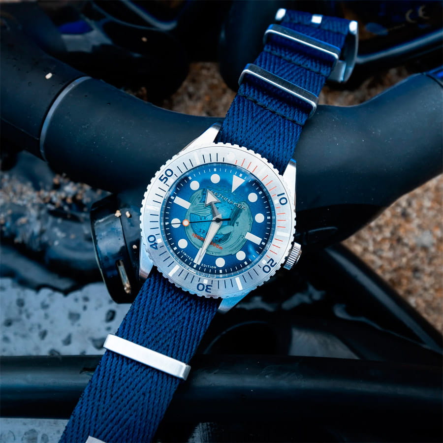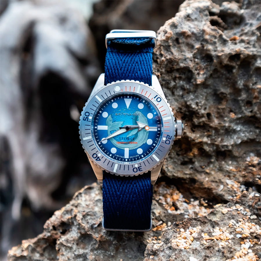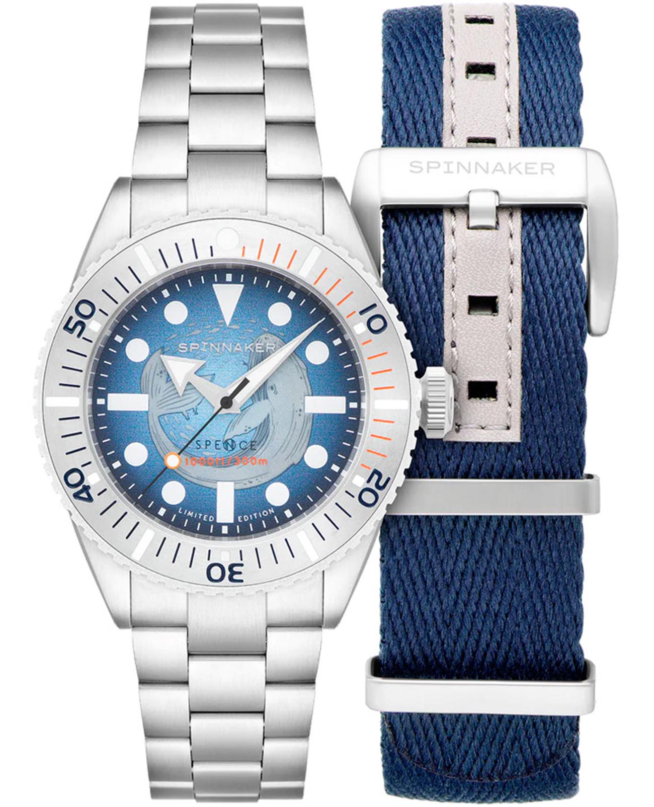 Мужские итальянские часы Spinnaker Spence SP-5124-11 из лимитированной серии (300 экземпляров). Механические часы с автоподзаводом. Циферблат с люминесцентным покрытиемЛюминесцентное покрытиеПозволяет считывать показания времени в темноте. Производители наносят на стрелки, часовые индексы, безель или поверхность циферблата светонакопительный состав, дающий холодное свечение. стрелок, меток и безеля дополнен сапфировым стекломСапфировое стеклоПрочный и надёжный материал из кристалла сапфира синтетического происхождения, характеризующийся особой твёрдостью и устойчивостью к царапинам и повреждениям. с антибликовым покрытиемАнтибликовое покрытиеСлой оксида металла в 0,13-0,3 микрон, благодаря которому стекло часов не бликует и не отражает свет. Антибликовое покрытие уменьшает отражение света в 10 раз, обеспечивая отличную читаемость показателей циферблата., устойчивым к появлению царапин и обладающее высокой прозрачностью. Класс водозащиты: 300 метров, позволит плавать, нырять и заниматься другими водными видами спорта. Корпус часов изготовлен из нержавеющей стали с поворотным безелемБезельВнешний ободок, закрепляющий стекло. В спортивных часах так называется поворотное кольцо с делениями на циферблате, выполняет роль таймера – замеряет отрезки времени на шкале. Неподвижный безель – элемент декора. Однонаправленно вращающийся безель на дайверских часах позволяет фиксировать моменты погружения и выныривания на поверхность. . Браслет выполнен из нержавеющей стали на раскладной застёжкеРаскладная застёжкаТакой тип застёжки используется только на браслетах из металла. Она никогда не раскрывается полностью, происходит разделение на 2 и более частей. Раскладывающая застёжка снизит вероятность потери часов к минимуму.. Ширина браслета 20 мм. В комплекте дополнительный нейлоновый ремешок синего цвета.