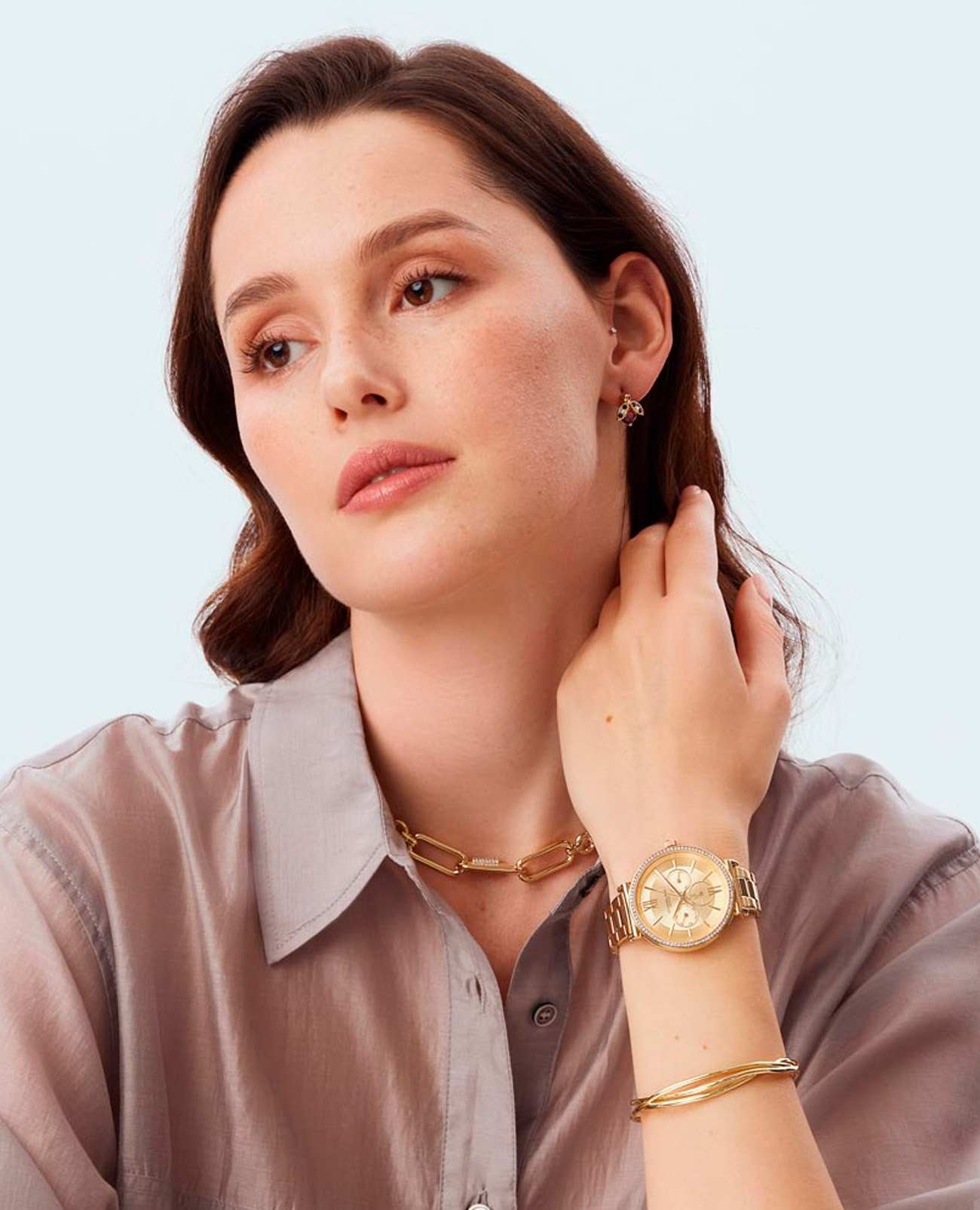 Женские наручные часы Stuhrling 3908.4 сочетают в себе элегантный дизайн и функциональность. Модель обладает круглым корпусом диаметром 40,0 мм, изготовленным из стали с желтым PVD-покрытиемPVDУльтратонкое покрытие наносится в технике вакуумного напыления, сочетает в себе нитрид титана особой прочности со слоем золота или оксида хрома. Несёт в себе декоративную или защитную функцию., что обеспечивает прочность и устойчивость к внешним воздействиям . Толщина корпуса составляет 8,5 мм, что делает часы достаточно компактными для повседневного использования . Браслет из того же материала на раскладной застёжкеРаскладная застёжкаТакой тип застёжки используется только на браслетах из металла. Она никогда не раскрывается полностью, происходит разделение на 2 и более частей. Раскладывающая застёжка снизит вероятность потери часов к минимуму.. Золотистый циферблат украшен римскими цифрами и накладными метками, подчеркивающими классический стиль модели . Для защиты используется стекло KrysternaKrysternaKrysterna — инновационное стекло для наручных часов. Благодаря уникальной структуре, Krysterna объединяет ключевые преимущества двух материалов: твердость сапфира, защищающую от царапин, и гибкость минерального стекла, обеспечивающую устойчивость к деформациям. Такая комбинация делает его идеальным решением для часов, подверженных экстремальным нагрузкам, сохраняя при этом оптическую прозрачность., обеспечивающее надежную защиту от царапин . Часы работают на кварцевом механизме, что гарантирует точное время без необходимости подзаводки . Водонепроницаемость часов составляет 30WR (3 атмосферы), что позволяет использовать их в повседневной жизни, включая контакт с водой, например, при мытье рук, но не рекомендуется для плавания или дайвинга . Модель станет идеальным аксессуаром для любой модницы, предпочитающей стильные и качественные аксессуары .