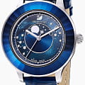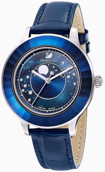 Женские часы Swarovski Octea Lux 5516305 – это специальный выпуск популярных часов Octea Lux приурочен к 50-летию первой высадки человека на Луну. Это первые часы Swarovski с полностью функциональным циферблатом, показывающим фазы Луны. Целая галактика прозрачных кристаллов сияет на фоне синего перламутрового циферблата. Он элегантно сочетается с кристальным безелемБезельВнешний ободок, закрепляющий стекло. В спортивных часах так называется поворотное кольцо с делениями на циферблате, выполняет роль таймера – замеряет отрезки времени на шкале. Неподвижный безель – элемент декора. Однонаправленно вращающийся безель на дайверских часах позволяет фиксировать моменты погружения и выныривания на поверхность. тёмного оттенка индиго с PVDPVDУльтратонкое покрытие наносится в технике вакуумного напыления, сочетает в себе нитрид титана особой прочности со слоем золота или оксида хрома. Несёт в себе декоративную или защитную функцию. покрытием и синим ремешком из натуральной кожи с тиснением под крокодила. Надежное минеральное стеклоМинеральное стеклоМинеральное стекло представляет собой искусственно выращенный минерал кварца. Такое стекло отличается особой устойчивостью к повреждениям и царапинам. Уступает по некоторым качествам сапфировому стеклу. защищает часы от царапин и долго сохраняет первоначальный внешний вид. Эти современные утончённые часы преобразят любой повседневный образ.