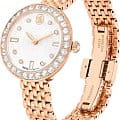 Часы Swarovski 5672981 – это воплощение изысканного дизайна и функциональности, созданное для тех, кто ценит красоту и точность. Стальной круглый корпус имеет красивую отделку PVDPVDУльтратонкое покрытие наносится в технике вакуумного напыления, сочетает в себе нитрид титана особой прочности со слоем золота или оксида хрома. Несёт в себе декоративную или защитную функцию. покрытием оттенка розового золота и оснащен безелемБезельВнешний ободок, закрепляющий стекло. В спортивных часах так называется поворотное кольцо с делениями на циферблате, выполняет роль таймера – замеряет отрезки времени на шкале. Неподвижный безель – элемент декора. Однонаправленно вращающийся безель на дайверских часах позволяет фиксировать моменты погружения и выныривания на поверхность., украшенным паве из тридцати мерцающих кристаллов. Под минеральным стекломМинеральное стеклоМинеральное стекло представляет собой искусственно выращенный минерал кварца. Такое стекло отличается особой устойчивостью к повреждениям и царапинам. Уступает по некоторым качествам сапфировому стеклу. открывается белый циферблат дополненный логотипом Swarovski в виде лебедя на 12 часах и кристаллами на отметках 3, 6 и 9 часов. Отсутствие секундной стрелки подчеркивает минимализм и утонченность дизайна. Рифленая заводная головка также украшена сверкающим кристаллом круглой огранки. Стальной браслет с отделкой PVDPVDУльтратонкое покрытие наносится в технике вакуумного напыления, сочетает в себе нитрид титана особой прочности со слоем золота или оксида хрома. Несёт в себе декоративную или защитную функцию. покрытием цвета розового золота и застежкой «бабочка»Застёжка "бабочка"Такой вид застёжки дополняется предохранителями, помогающими избежать случайного раскрытия браслета. Обладают изящным исполнением. . Водозащита 50WR делает их устойчивыми к влаге, позволяя наслаждаться стильным аксессуаром в любых условиях.