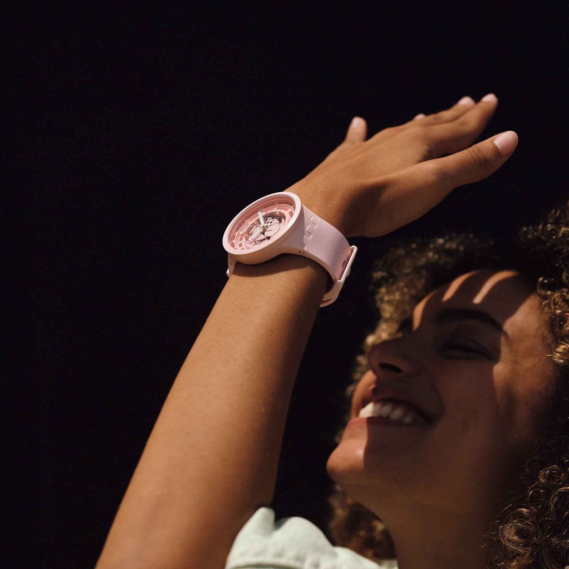 Часы Swatch SB03P100 — это стильный и современный аксессуар для тех, кто ценит лёгкость и комфорт. Часы идеально подойдут как для мужчин, так и для женщин. Прекрасный образец часов, выполненных полностью из материалов биологического происхождения: открытый механизм и биокерамикаБиокерамикаБиокерамика — это материал, который на две трети состоит из керамики, на одну треть — из биопластика. Он сочетает в себе лучшие качества обоих материалов и обладает прочностью и шелковистой на ощупь текстурой., которая создает ощущение шелковистости. Впечатляющий дизайн розового цвета — инновация в своем лучшем проявлении. На часовую, минутную стрелки нанесено люминесцентное покрытиеЛюминесцентное покрытиеПозволяет считывать показания времени в темноте. Производители наносят на стрелки, часовые индексы, безель или поверхность циферблата светонакопительный состав, дающий холодное свечение., которое светится в темноте, создавая необычное изображение. Водозащита 30 метров делает часы практичными для повседневного использования. Эти часы подойдут для повседневного ношения и станут ярким акцентом в вашем наряде.