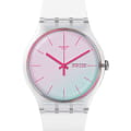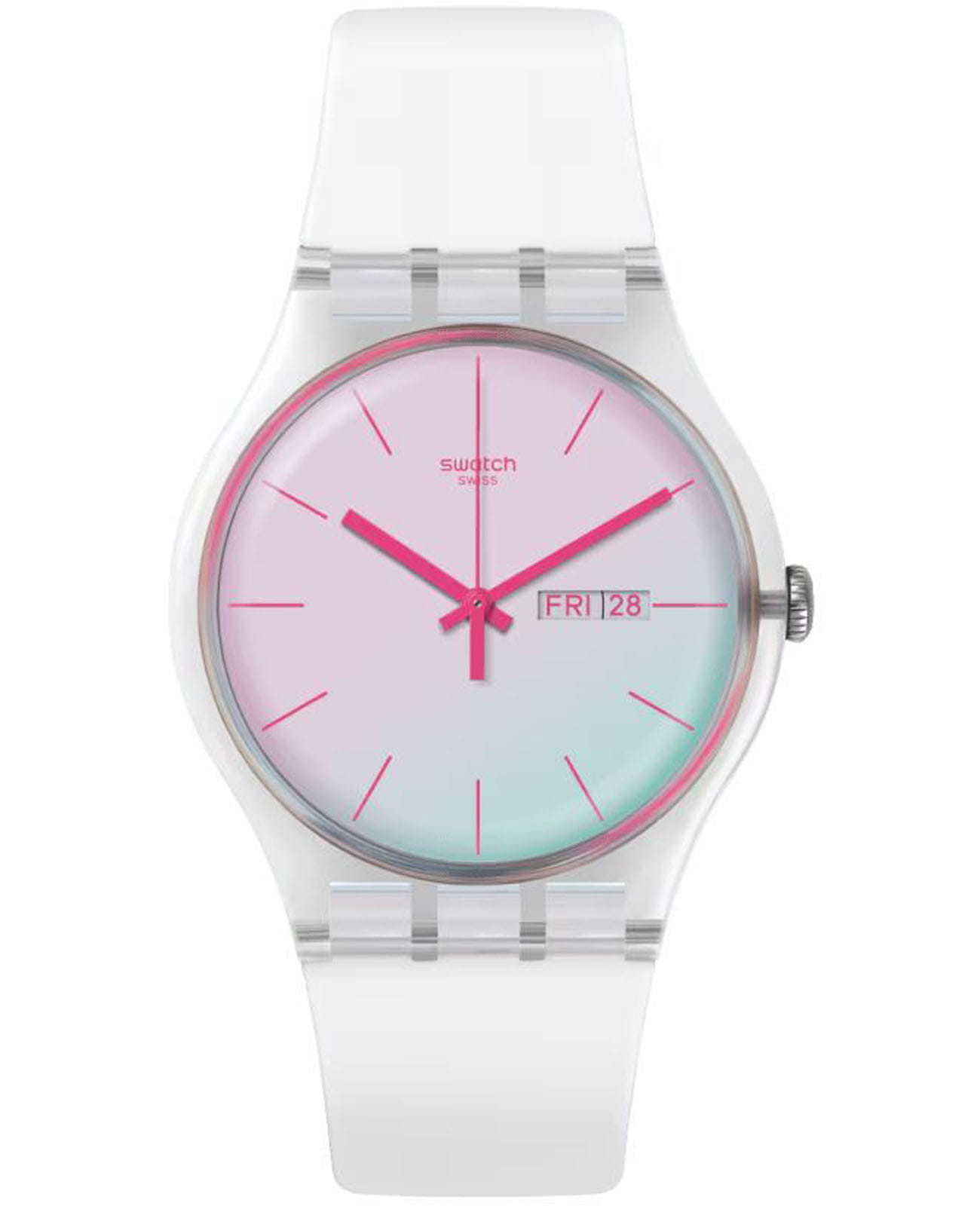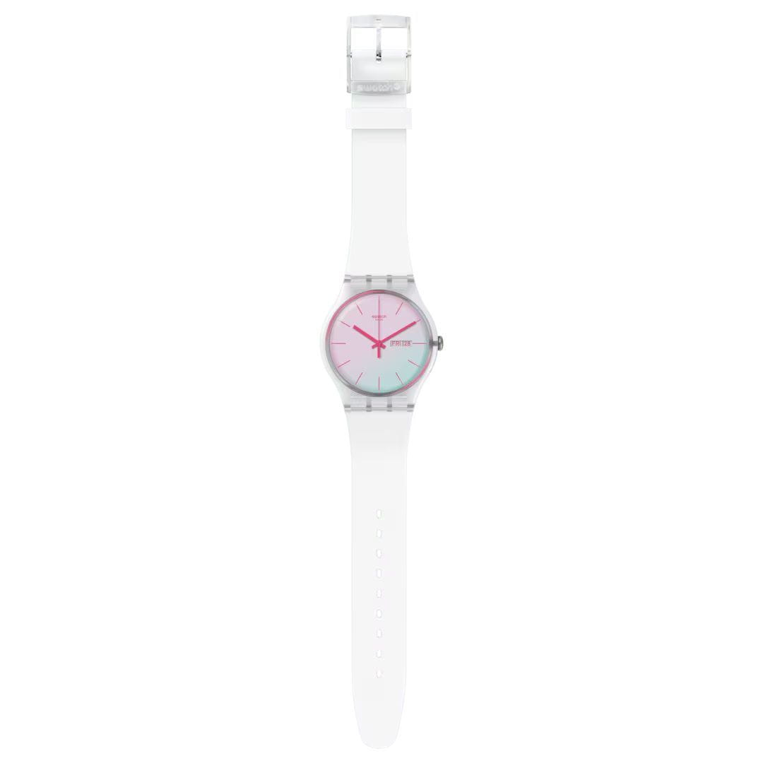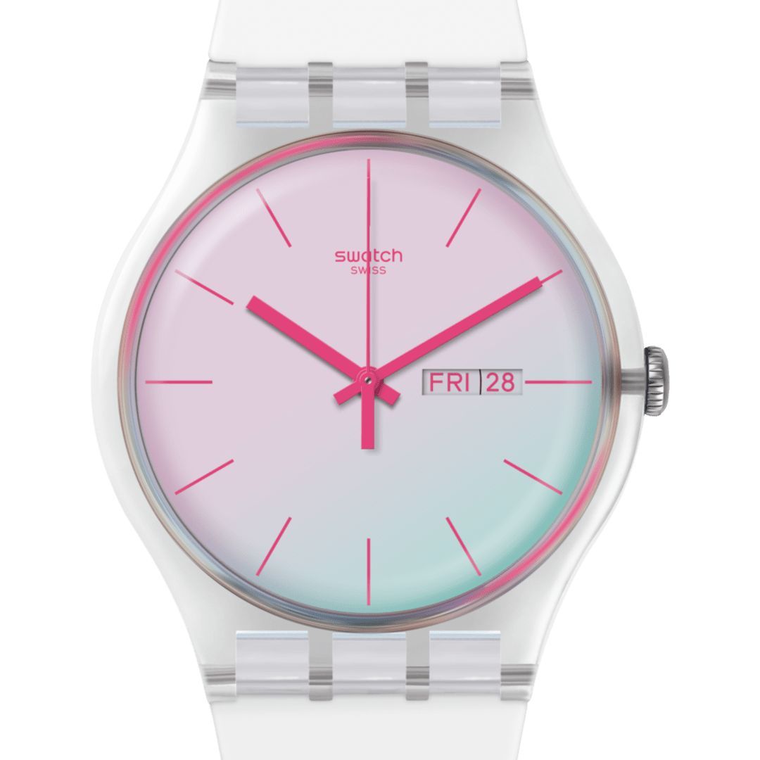 Часы Swatch SO29K704 —  стильный и надежный аксессуар. Эти часы имеют белый циферблат с розовыми индексами и стекло Solar Spectrum. У них прозрачный корпус из биоматериала, а также белый ремешок и петля. Окошко даты и дня недели с розовыми буквами на уровне 3 часов. Ремешок из силикона на стандартной застёжке. Внутри часов установлен надежный кварцевый механизм, который обеспечивает точность хода. Эти часы водонепроницаемы до 30 метров, что позволяет не беспокоиться о случайных брызгах или дождевых каплях. Swatch SO29K704 — это идеальный выбор для тех, кто ценит сочетание стиля, комфорта и функциональности в одном аксессуаре.