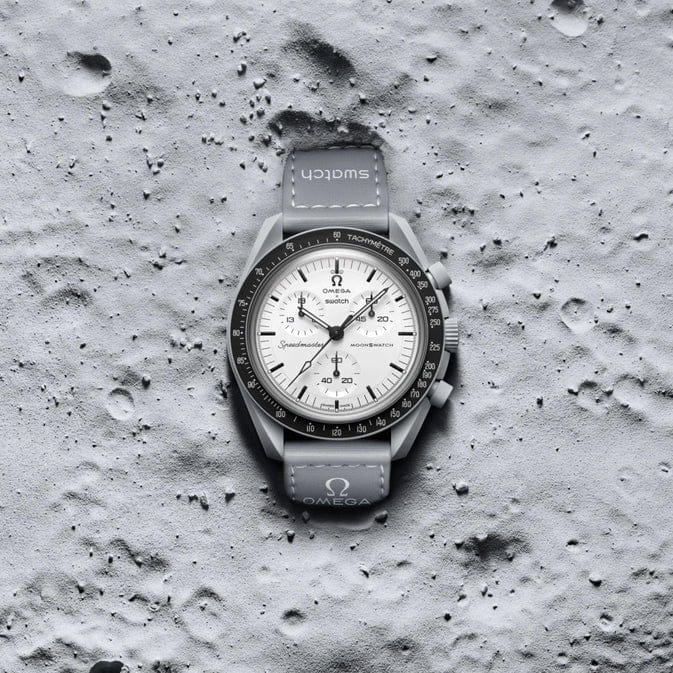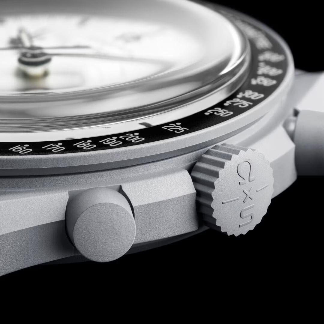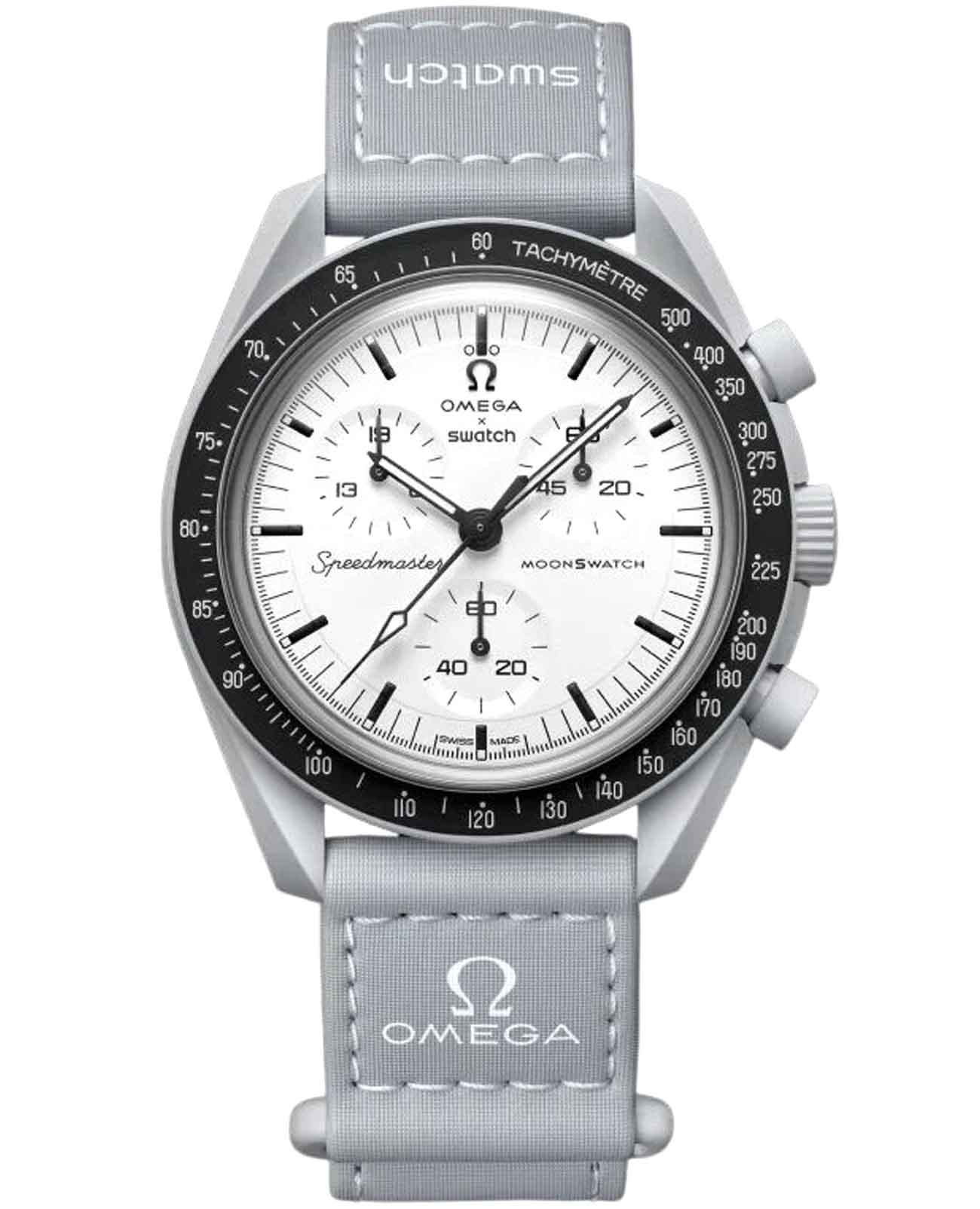 Часы Swatch Bioceramic Moonswatch 1965 SO33M106 — это стильный и современный аксессуар для тех, кто ценит лёгкость и комфорт. Часы идеально подойдут как для мужчин, так и для женщин. Корпус диаметром 42 мм и пряжка этих уникальных часов изготовлены из биокерамикиБиокерамикаБиокерамика — это материал, который на две трети состоит из керамики, на одну треть — из биопластика. Он сочетает в себе лучшие качества обоих материалов и обладает прочностью и шелковистой на ощупь текстурой. серой расцветки, напоминающей нержавеющую сталь. Модель оснащена белым циферблатом и черным биокерамическим безелемБезельВнешний ободок, закрепляющий стекло. В спортивных часах так называется поворотное кольцо с делениями на циферблате, выполняет роль таймера – замеряет отрезки времени на шкале. Неподвижный безель – элемент декора. Однонаправленно вращающийся безель на дайверских часах позволяет фиксировать моменты погружения и выныривания на поверхность. с нанесенной на него шкалой тахиметраТахиметрРазмеченная шкала, располагается на ободке или безеле часов. Тахиметр позволяет рассчитать скорость на определённом участке пути, расстояние измеряется в километрах или милях., а также ремешком с липучкой VELCRO®. Часовые отметки, часовая и минутная стрелки, а также кончик секундной стрелки хронографаХронографФункция позволяет измерять отрезки времени с особой точностью: часы, минуты, секунды. Верным признаком хронографа является наличие на циферблате 3 дополнительных окошек-счётчиков. покрыты люминесцентным покрытиемЛюминесцентное покрытиеПозволяет считывать показания времени в темноте. Производители наносят на стрелки, часовые индексы, безель или поверхность циферблата светонакопительный состав, дающий холодное свечение. Super-LumiNova® класса А, благодаря чему они прекрасно светятся в темноте (зеленым свечением). Циферблаты каждых часов в данной коллекции украшены фирменным знаком OMEGA X Swatch, культовым логотипом Speedmaster и логотипом MoonSwatch.