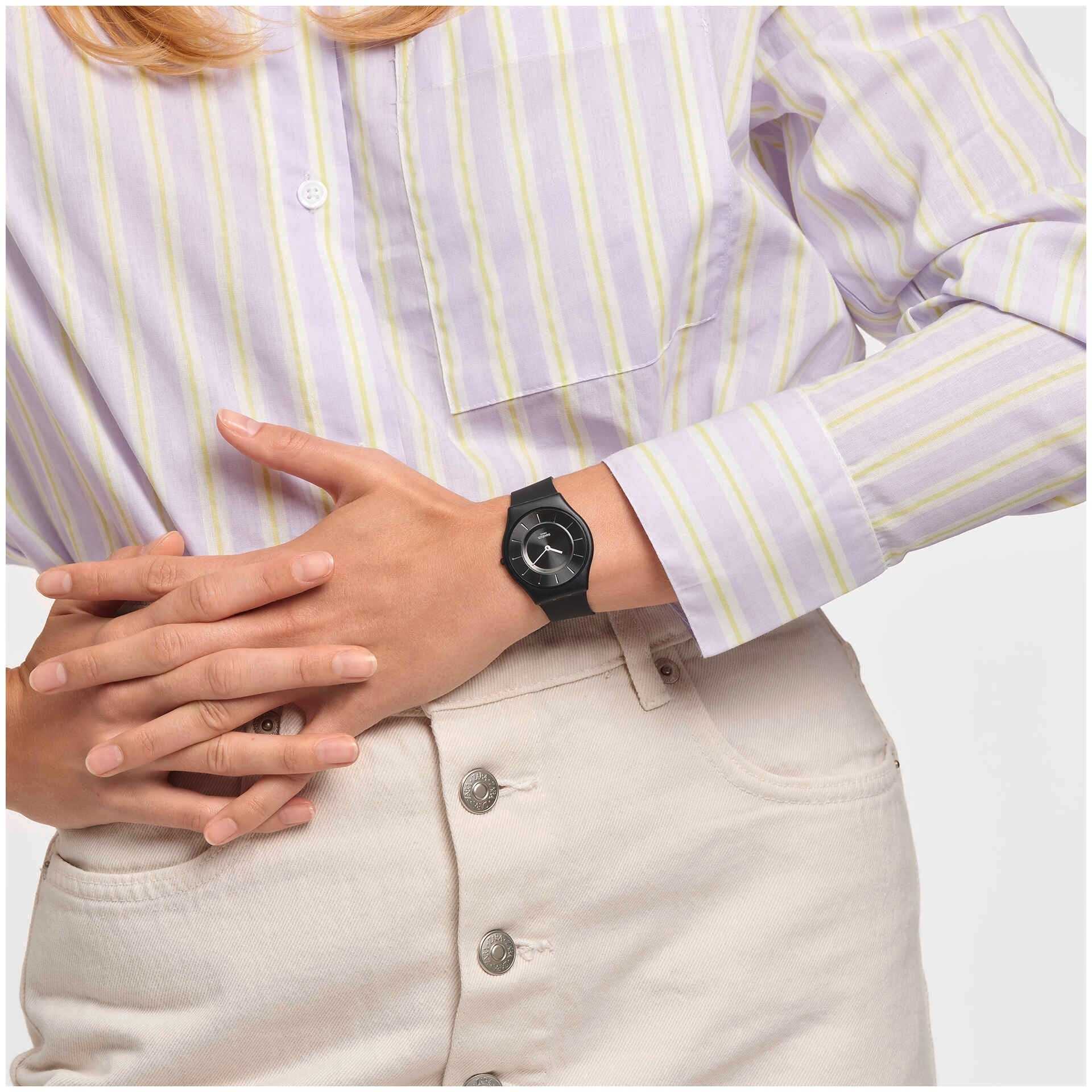Часы Swatch SS08B100-S14 — это стильный и современный аксессуар для тех, кто ценит лёгкость и комфорт. Часы идеально подойдут как для мужчин, так и для женщин. Ультратонкие часы с корпусом из биоматериала и черным матовым циферблатом с радиальной полировкой, на котором размещены контрастные белые стрелки и принт. Дополнительную изысканность модели придает матово-черный ремешок с тренчиком и пряжкой в тон. Водозащита 30 метров делает часы практичными для повседневного использования. Эти часы подойдут для повседневного ношения и станут ярким акцентом в вашем наряде.