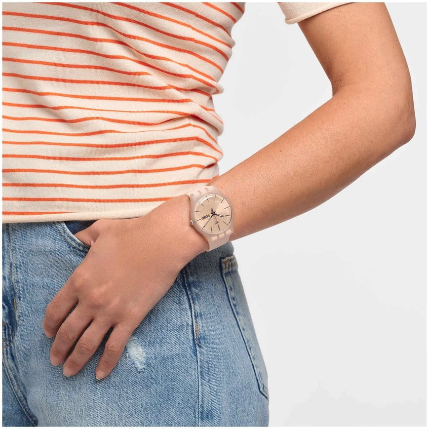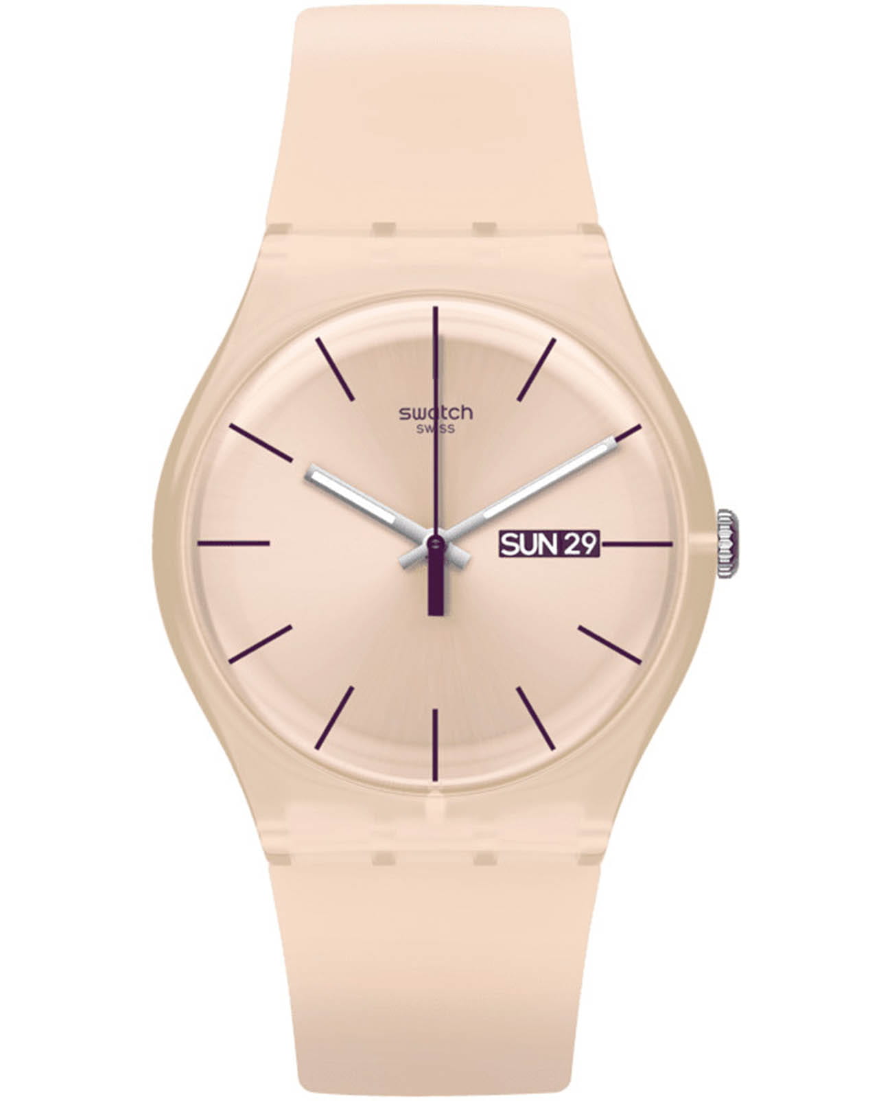 Часы Swatch SUOT700 — это стильный и современный аксессуар для тех, кто ценит лёгкость и комфорт. Часы идеально подойдут как для мужчин, так и для женщин. Элегантный и запоминающийся дизайн, в котором цвет создает настроение и атмосферу. Эти часы представляют собой однотонный силиконовый ремешок бледно-розового цвета с петелькой, дополненный прозрачным корпусом из розового пластика и пряжкой в тон. На матовом циферблате с тонкими фиолетовыми индексами на всех часах и контрастным фиолетовым окошком дня и даты в положении "3 часа". На часовую, минутную стрелки фиолетового цвета нанесено люминесцентное покрытиеЛюминесцентное покрытиеПозволяет считывать показания времени в темноте. Производители наносят на стрелки, часовые индексы, безель или поверхность циферблата светонакопительный состав, дающий холодное свечение., которое светится в темноте, создавая необычное изображение. Водозащита 30 метров делает часы практичными для повседневного использования. Эти часы подойдут для повседневного ношения и станут ярким акцентом в вашем наряде.