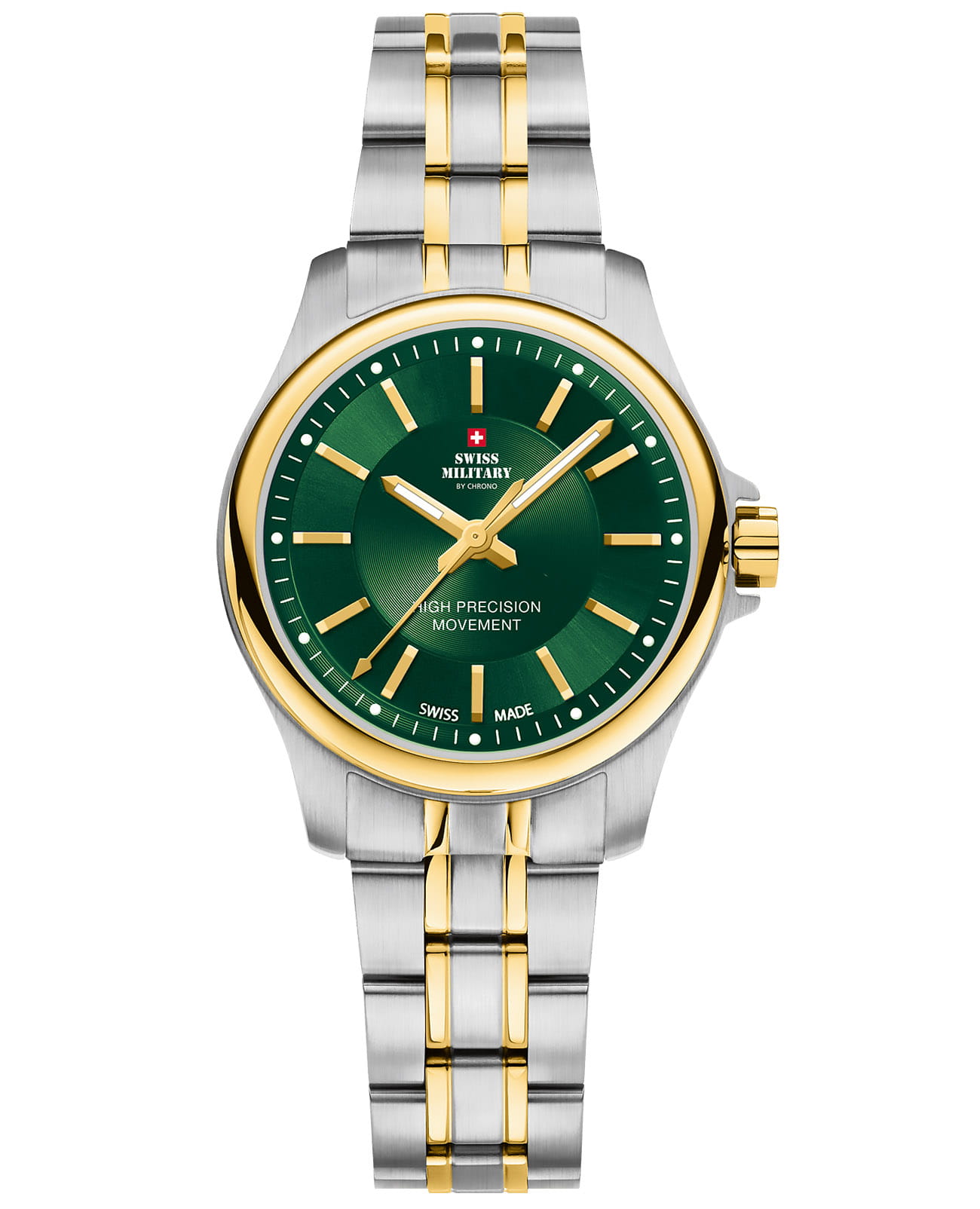 Женские швейцарские наручные часы Swiss Military by Chrono SM30201.32, кварцевый механизм с высокой точностью. Сапфировое стеклоСапфировое стеклоПрочный и надёжный материал из кристалла сапфира синтетического происхождения, характеризующийся особой твёрдостью и устойчивостью к царапинам и повреждениям. устойчивое к появлению царапин, обладающее высокой прозрачностью. Класс водозащиты: 100 метров, позволит плавать, нырять и заниматься другими водными видами спорта. Корпус часов изготовлен из стали.БезельБезельВнешний ободок, закрепляющий стекло. В спортивных часах так называется поворотное кольцо с делениями на циферблате, выполняет роль таймера – замеряет отрезки времени на шкале. Неподвижный безель – элемент декора. Однонаправленно вращающийся безель на дайверских часах позволяет фиксировать моменты погружения и выныривания на поверхность. с PVD-покрытиемPVDУльтратонкое покрытие наносится в технике вакуумного напыления, сочетает в себе нитрид титана особой прочности со слоем золота или оксида хрома. Несёт в себе декоративную или защитную функцию.. Браслет с раскладной застёжкойРаскладная застёжкаТакой тип застёжки используется только на браслетах из металла. Она никогда не раскрывается полностью, происходит разделение на 2 и более частей. Раскладывающая застёжка снизит вероятность потери часов к минимуму. и с частичным PVD-покрытиемPVDУльтратонкое покрытие наносится в технике вакуумного напыления, сочетает в себе нитрид титана особой прочности со слоем золота или оксида хрома. Несёт в себе декоративную или защитную функцию..
