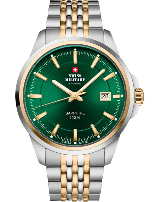 Модель SM34104.06 от Swiss Military by Chrono — это надёжные швейцарские часы в классическом стиле, сочетающие функциональность и сдержанный дизайн. Корпус и браслет выполнены из нержавеющей стали, подчёркивая прочность и элегантность конструкции. Строгий циферблат обеспечивает отличную читаемость, а функция отображения даты добавляет практичности. БезельБезельВнешний ободок, закрепляющий стекло. В спортивных часах так называется поворотное кольцо с делениями на циферблате, выполняет роль таймера – замеряет отрезки времени на шкале. Неподвижный безель – элемент декора. Однонаправленно вращающийся безель на дайверских часах позволяет фиксировать моменты погружения и выныривания на поверхность. с PVD-покрытиемPVDУльтратонкое покрытие наносится в технике вакуумного напыления, сочетает в себе нитрид титана особой прочности со слоем золота или оксида хрома. Несёт в себе декоративную или защитную функцию.. Часы оснащены кварцевым механизмом, обеспечивающим точный ход. Циферблат защищён сапфировым стекломСапфировое стеклоПрочный и надёжный материал из кристалла сапфира синтетического происхождения, характеризующийся особой твёрдостью и устойчивостью к царапинам и повреждениям., устойчивым к царапинам. Установлена раскладная застёжкаРаскладная застёжкаТакой тип застёжки используется только на браслетах из металла. Она никогда не раскрывается полностью, происходит разделение на 2 и более частей. Раскладывающая застёжка снизит вероятность потери часов к минимуму. для надёжной фиксации на запястье и частичное PVD-покрытиеPVDУльтратонкое покрытие наносится в технике вакуумного напыления, сочетает в себе нитрид титана особой прочности со слоем золота или оксида хрома. Несёт в себе декоративную или защитную функцию. браслета. Модель обладает водонепроницаемостью до 100 метров, что делает её подходящей для плавания и сноркелинга.