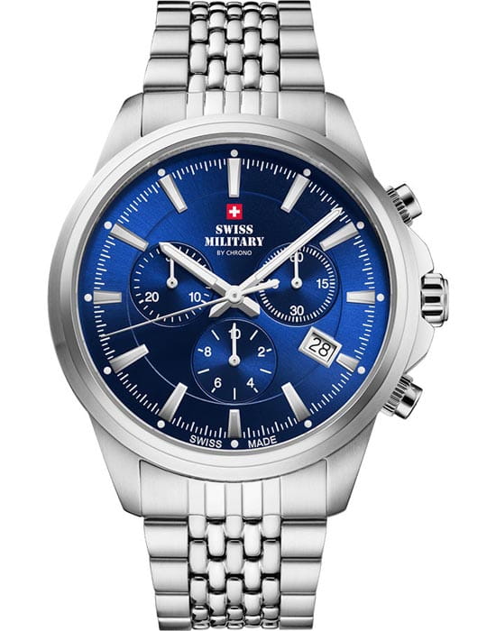 Часы Swiss Military SM34107.03 — это хронограф, сочетающий стиль и функциональность. Корпус диаметром 40 мм выполнен из нержавеющей стали, что обеспечивает долговечность и надёжность. Циферблат с солнечным узором украшен белыми люминесцентными индексамиЛюминесцентное покрытиеПозволяет считывать показания времени в темноте. Производители наносят на стрелки, часовые индексы, безель или поверхность циферблата светонакопительный состав, дающий холодное свечение. и стрелками, что позволяет легко считывать время в любых условиях. Защиту циферблата обеспечивает сапфировое стеклоСапфировое стеклоПрочный и надёжный материал из кристалла сапфира синтетического происхождения, характеризующийся особой твёрдостью и устойчивостью к царапинам и повреждениям., устойчивое к царапинам. Водозащита до 10 ATM делает часы подходящими для плавания и других водных активностей. Швейцарский кварцевый механизм обеспечивает высокую точность измерения времени и функции хронографа. Стальной браслет на раскладной застёжкеРаскладная застёжкаТакой тип застёжки используется только на браслетах из металла. Она никогда не раскрывается полностью, происходит разделение на 2 и более частей. Раскладывающая застёжка снизит вероятность потери часов к минимуму. гарантирует комфортное ношение и надёжную фиксацию. Часы сопровождаются 5-летней международной гарантией, подтверждающей их высокое качество и надёжность. Swiss Military — это идеальный выбор для мужчин, которые ценят швейцарское качество и ведут активный образ жизни.