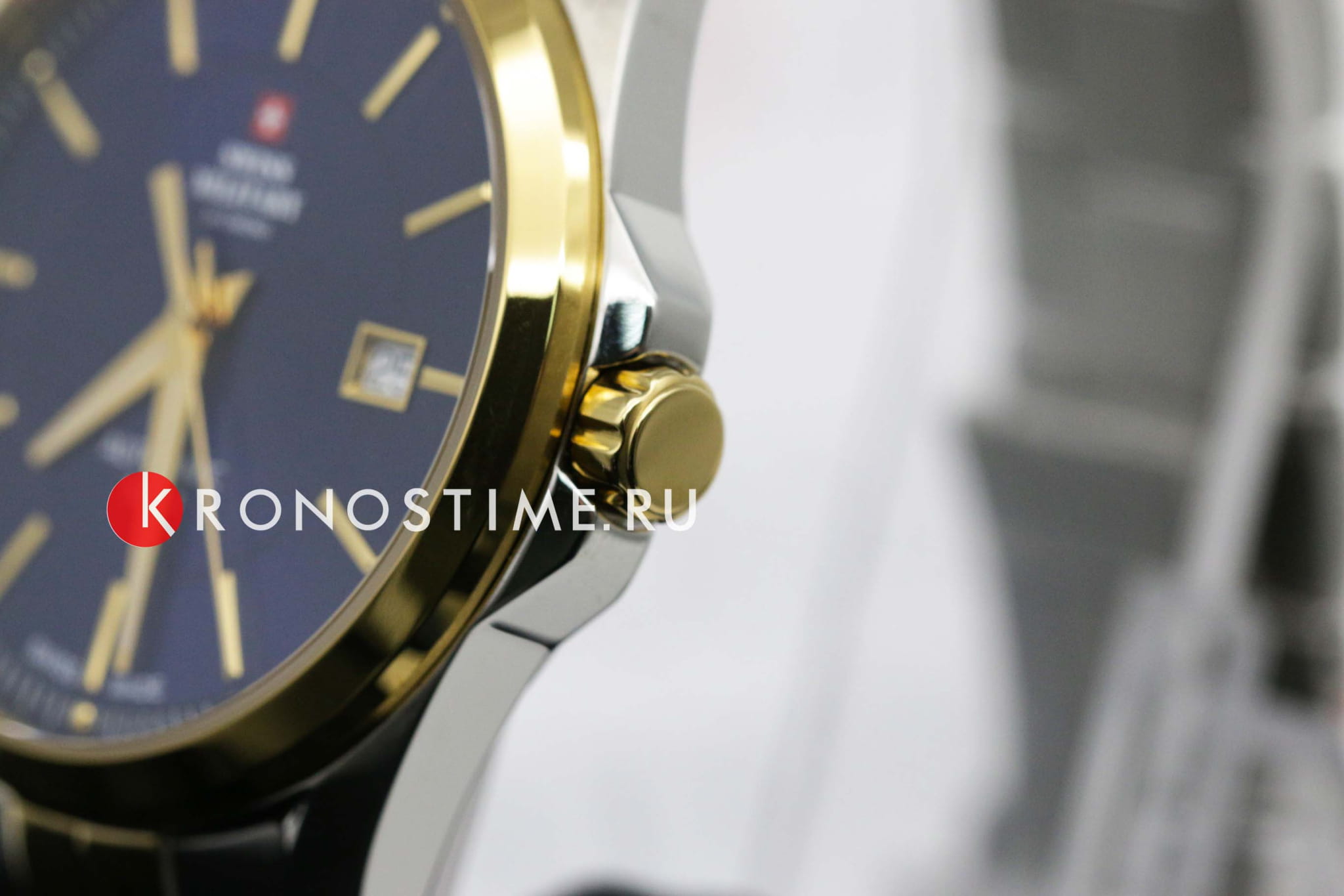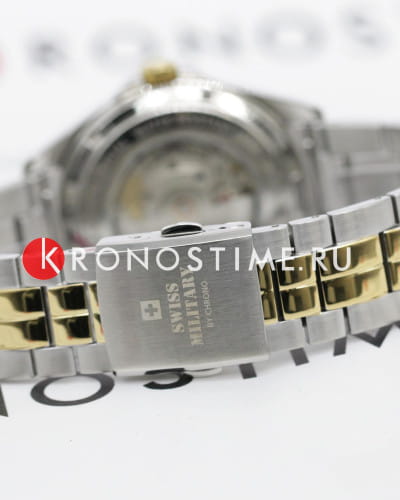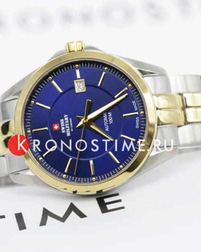 Мужские швейцарские наручные часы Swiss Military by Chrono SMA34085.07, механический механизм (автоматический калибр) с высокой точностью. Сапфировое стеклоСапфировое стеклоПрочный и надёжный материал из кристалла сапфира синтетического происхождения, характеризующийся особой твёрдостью и устойчивостью к царапинам и повреждениям. устойчивое к появлению царапин, обладающее высокой прозрачностью. Класс водозащиты: 100 метров, позволит плавать, нырять и заниматься другими водными видами спорта. Корпус часов изготовлен из стали с частичным PVD-покрытиемPVDУльтратонкое покрытие наносится в технике вакуумного напыления, сочетает в себе нитрид титана особой прочности со слоем золота или оксида хрома. Несёт в себе декоративную или защитную функцию., цвета желтое золото. Люминесцентная подсветкаЛюминесцентное покрытиеПозволяет считывать показания времени в темноте. Производители наносят на стрелки, часовые индексы, безель или поверхность циферблата светонакопительный состав, дающий холодное свечение. стрелок. Браслет с раскладной застёжкойРаскладная застёжкаТакой тип застёжки используется только на браслетах из металла. Она никогда не раскрывается полностью, происходит разделение на 2 и более частей. Раскладывающая застёжка снизит вероятность потери часов к минимуму..