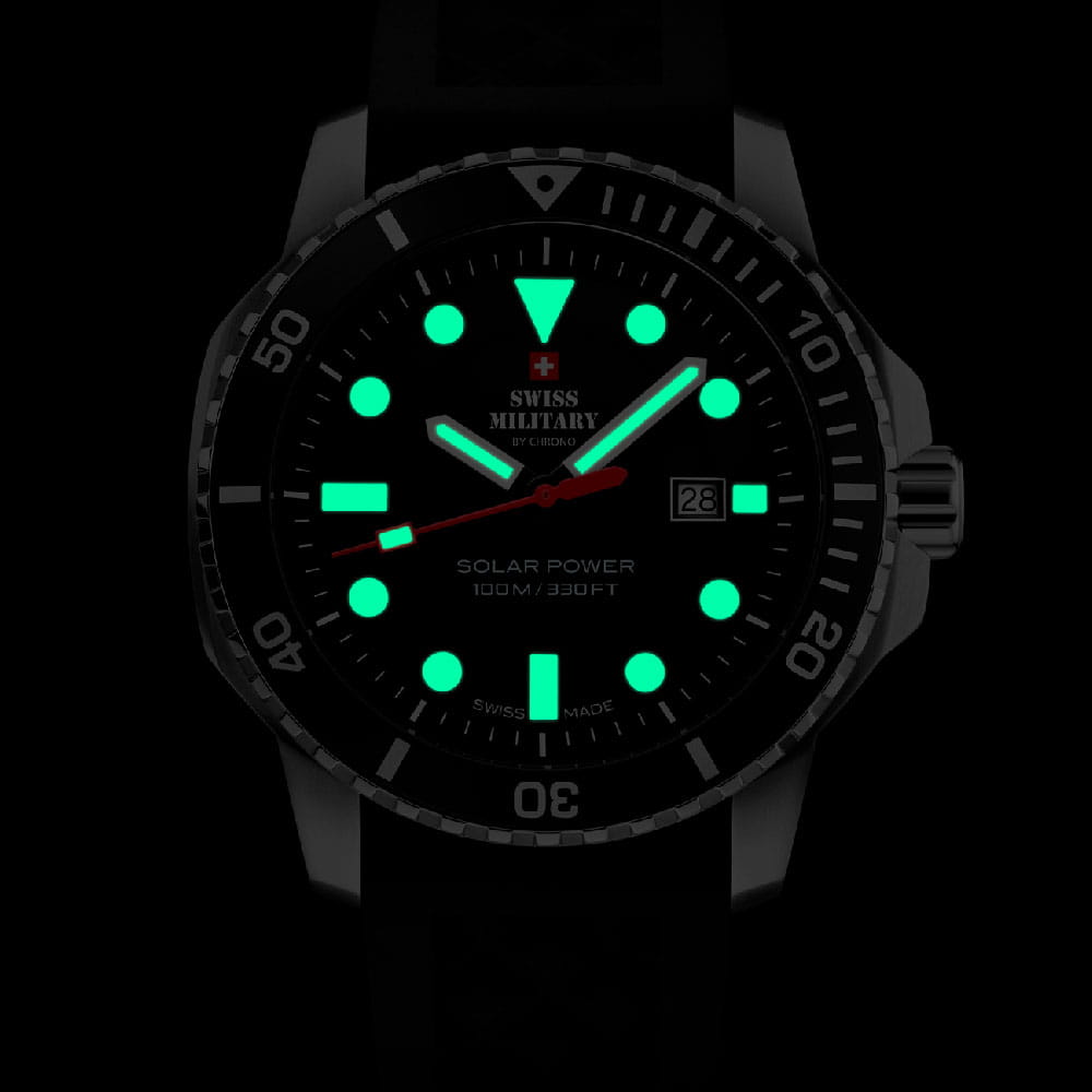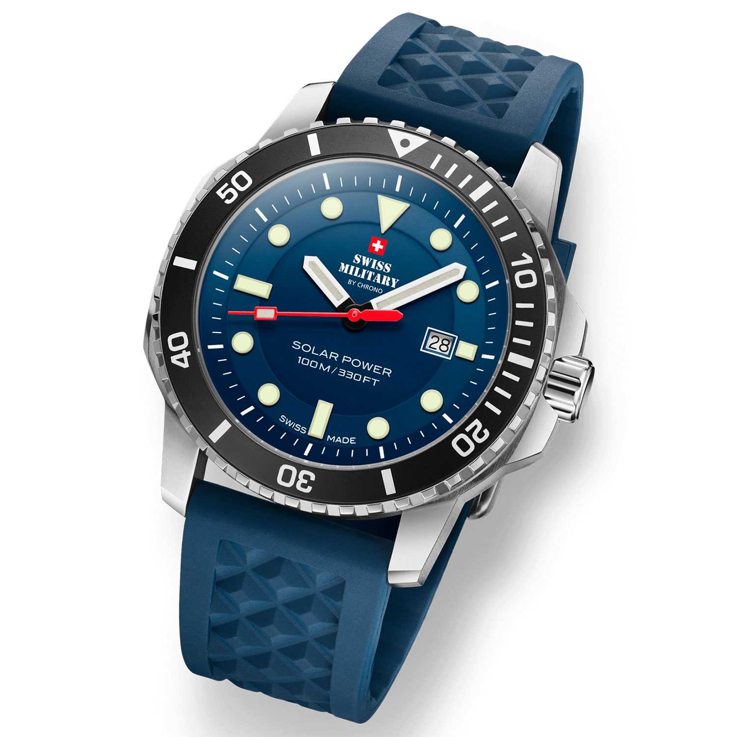 Модель SMS34102.04 от Swiss Military by Chrono — это надёжные швейцарские спортивные часы, сочетающие в себе прочность, функциональность и элегантный дизайн. Корпус выполнен из нержавеющей стали, подчёркивая прочность и элегантность конструкции. Циферблат с солнечным узором и крупными метками, покрытыми люминесцентным покрытиемЛюминесцентное покрытиеПозволяет считывать показания времени в темноте. Производители наносят на стрелки, часовые индексы, безель или поверхность циферблата светонакопительный состав, дающий холодное свечение., обеспечивает отличную читаемость в любых условиях. Часы оснащены швейцарским солнечным кварцевым механизмом Ronda Solartech Caliber 215, обеспечивающим точный ход и запас хода до 8 месяцев без подзарядки. Циферблат защищён сапфировым стекломСапфировое стеклоПрочный и надёжный материал из кристалла сапфира синтетического происхождения, характеризующийся особой твёрдостью и устойчивостью к царапинам и повреждениям., устойчивым к царапинам. Силиконовый ремешок на стандартной застежке для надёжной фиксации на запястье. Односторонний вращающийся безель с PVD-покрытиемPVDУльтратонкое покрытие наносится в технике вакуумного напыления, сочетает в себе нитрид титана особой прочности со слоем золота или оксида хрома. Несёт в себе декоративную или защитную функцию. позволяет точно отслеживать время. Модель обладает водонепроницаемостью до 100 метров, что делает её подходящей для плавания и сноркелинга.