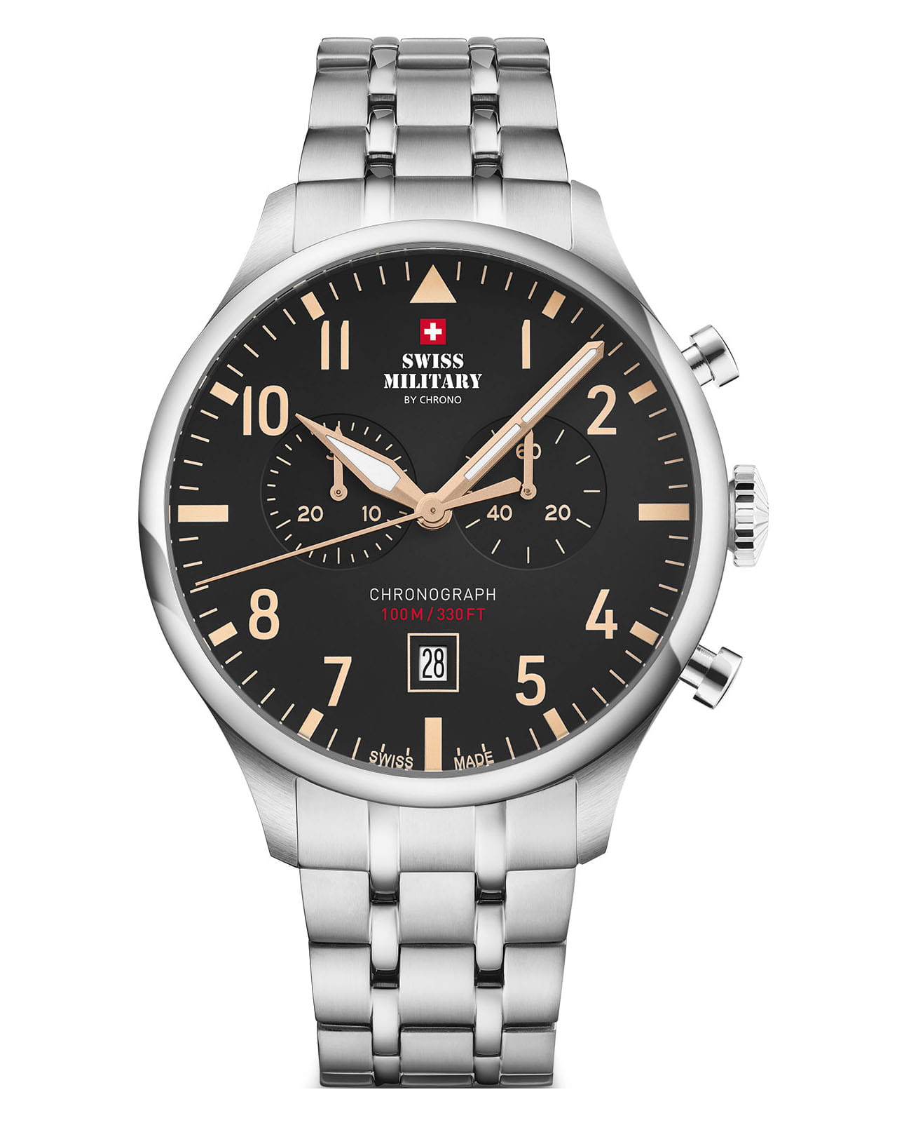 Мужские швейцарские часы-хронографХронографФункция позволяет измерять отрезки времени с особой точностью: часы, минуты, секунды. Верным признаком хронографа является наличие на циферблате 3 дополнительных окошек-счётчиков. с секундомеромСекундомерСекундоме́р — прибор, способный измерять интервалы времени с точностью до долей секунды. Swiss Military by Chrono Vintage Chronograph SM34098.04, кварцевый механизм с высокой точностью. Сапфировое стеклоСапфировое стеклоПрочный и надёжный материал из кристалла сапфира синтетического происхождения, характеризующийся особой твёрдостью и устойчивостью к царапинам и повреждениям. устойчивое к мелким механическим повреждениям. Корпус часов изготовлен из нержавеющей стали. На циферблате расположены два дополнительных индикатора и окошко даты. Окошко даты находится в положении 6 часов. Стрелки с люминесцентным покрытиемЛюминесцентное покрытиеПозволяет считывать показания времени в темноте. Производители наносят на стрелки, часовые индексы, безель или поверхность циферблата светонакопительный состав, дающий холодное свечение.. Класс водозащиты: 100 метров, позволит плавать, нырять и заниматься другими водными видами спорта. Стальной браслет на раскладной застёжкеРаскладная застёжкаТакой тип застёжки используется только на браслетах из металла. Она никогда не раскрывается полностью, происходит разделение на 2 и более частей. Раскладывающая застёжка снизит вероятность потери часов к минимуму..