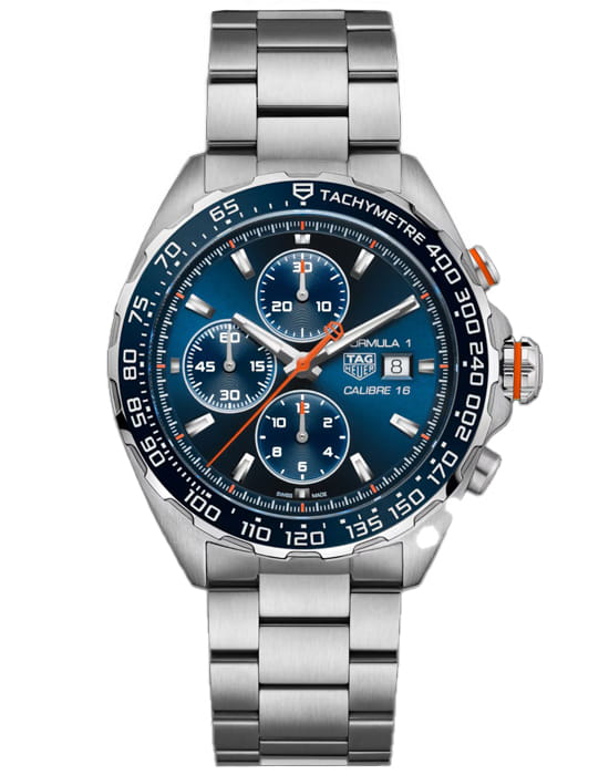 Мужские швейцарские наручные механические часы-хронографХронографФункция позволяет измерять отрезки времени с особой точностью: часы, минуты, секунды. Верным признаком хронографа является наличие на циферблате 3 дополнительных окошек-счётчиков. TAG Heuer Formula 1 Chronograph CAZ201G.BA0876. Сапфировое стеклоСапфировое стеклоПрочный и надёжный материал из кристалла сапфира синтетического происхождения, характеризующийся особой твёрдостью и устойчивостью к царапинам и повреждениям. устойчивое к появлению царапин, обладающее высокой прозрачностью. Стрелки и метки с люминесцентным покрытиемЛюминесцентное покрытиеПозволяет считывать показания времени в темноте. Производители наносят на стрелки, часовые индексы, безель или поверхность циферблата светонакопительный состав, дающий холодное свечение.. Класс водозащиты: 200 метров, позволит плавать, нырять и заниматься другими водными видами спорта. Корпус часов изготовлен из стали и керамики. Браслет с раскладной застёжкойРаскладная застёжкаТакой тип застёжки используется только на браслетах из металла. Она никогда не раскрывается полностью, происходит разделение на 2 и более частей. Раскладывающая застёжка снизит вероятность потери часов к минимуму.. Вращающийся стальной безельБезельВнешний ободок, закрепляющий стекло. В спортивных часах так называется поворотное кольцо с делениями на циферблате, выполняет роль таймера – замеряет отрезки времени на шкале. Неподвижный безель – элемент декора. Однонаправленно вращающийся безель на дайверских часах позволяет фиксировать моменты погружения и выныривания на поверхность.. Окошко даты находится в положении 3 часов.
