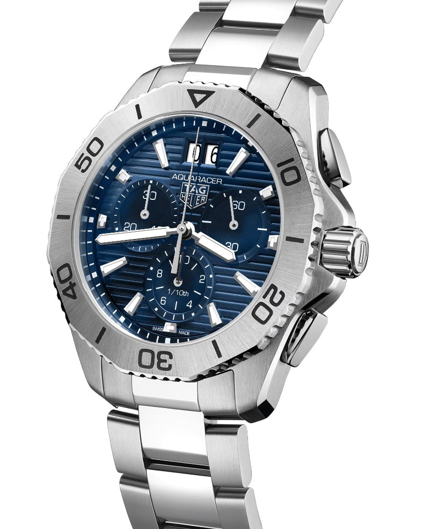 Мужские швейцарские наручные кварцевые часы-хронографХронографФункция позволяет измерять отрезки времени с особой точностью: часы, минуты, секунды. Верным признаком хронографа является наличие на циферблате 3 дополнительных окошек-счётчиков. TAG Heuer Aquaracer Professional Chronograph CBP1113.BA0627. Сапфировое стеклоСапфировое стеклоПрочный и надёжный материал из кристалла сапфира синтетического происхождения, характеризующийся особой твёрдостью и устойчивостью к царапинам и повреждениям. устойчивое к появлению царапин, обладающее высокой прозрачностью. Стрелки и метки с люминесцентным покрытиемЛюминесцентное покрытиеПозволяет считывать показания времени в темноте. Производители наносят на стрелки, часовые индексы, безель или поверхность циферблата светонакопительный состав, дающий холодное свечение.. Класс водозащиты: 200 метров, позволит плавать, нырять и заниматься другими водными видами спорта. Корпус часов изготовлен из нержавеющей стали. Браслет с раскладной застёжкойРаскладная застёжкаТакой тип застёжки используется только на браслетах из металла. Она никогда не раскрывается полностью, происходит разделение на 2 и более частей. Раскладывающая застёжка снизит вероятность потери часов к минимуму.. Вращающийся стальной безельБезельВнешний ободок, закрепляющий стекло. В спортивных часах так называется поворотное кольцо с делениями на циферблате, выполняет роль таймера – замеряет отрезки времени на шкале. Неподвижный безель – элемент декора. Однонаправленно вращающийся безель на дайверских часах позволяет фиксировать моменты погружения и выныривания на поверхность.. Окошко даты находится в положении 12 часов.