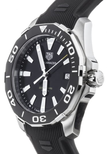 TAG Heuer Aquaracer WAY111A.FT6151 — элегантные мужские часы, сочетающие современный дизайн и высокую функциональность. Корпус диаметром 41 мм выполнен из стали и безельБезельВнешний ободок, закрепляющий стекло. В спортивных часах так называется поворотное кольцо с делениями на циферблате, выполняет роль таймера – замеряет отрезки времени на шкале. Неподвижный безель – элемент декора. Однонаправленно вращающийся безель на дайверских часах позволяет фиксировать моменты погружения и выныривания на поверхность. из стали с аллюминием с PVD-покрытиемPVDУльтратонкое покрытие наносится в технике вакуумного напыления, сочетает в себе нитрид титана особой прочности со слоем золота или оксида хрома. Несёт в себе декоративную или защитную функцию., обеспечивающим лёгкость и прочность. Циферблат с часовыми метками и стрелками, покрытыми люминесцентным покрытиемЛюминесцентное покрытиеПозволяет считывать показания времени в темноте. Производители наносят на стрелки, часовые индексы, безель или поверхность циферблата светонакопительный состав, дающий холодное свечение., гарантирует отличную читаемость в любых условиях освещения. Часы оснащены точным кварцевым механизмом, обеспечивающим стабильное отображение времени. Функциональность включает индикацию часов, минут, секунд и даты, расположенной на отметке «3 часа». Сапфировое стеклоСапфировое стеклоПрочный и надёжный материал из кристалла сапфира синтетического происхождения, характеризующийся особой твёрдостью и устойчивостью к царапинам и повреждениям. обеспечивает надёжную защиту от царапин и превосходную читаемость. Чёрный каучуковый ремешок оснащён стандартной застежкой. Водозащита до 300 метров (30 бар) делает модель идеальной для дайвинга и активного образа жизни.