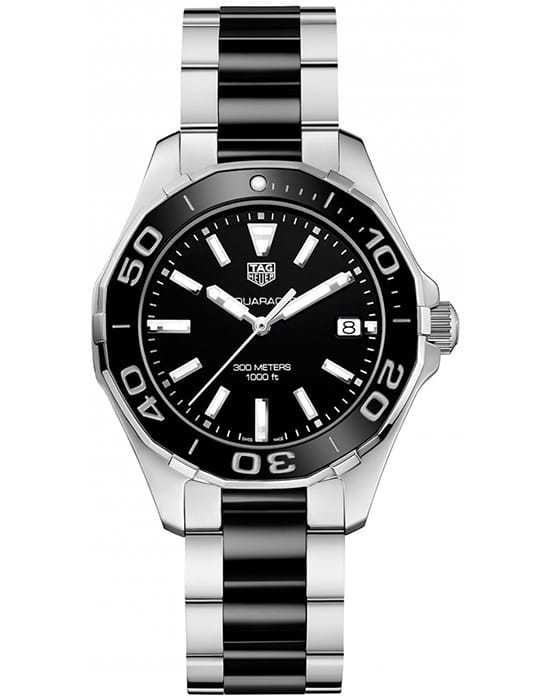 TAG Heuer Aquaracer WAY131A.BA0913 — элегантные женские часы, сочетающие стиль и функциональность. Корпус диаметром 35 мм и толщиной 10,75 мм выполнен из полированной нержавеющей стали, обеспечивая долговечность и устойчивость к коррозии. Чёрный лакированный циферблат оснащён накладными часовыми метками и стрелками с люминесцентным покрытиемЛюминесцентное покрытиеПозволяет считывать показания времени в темноте. Производители наносят на стрелки, часовые индексы, безель или поверхность циферблата светонакопительный состав, дающий холодное свечение., обеспечивающим отличную читаемость в любых условиях освещения. Его поверхность защищена сапфировым стекломСапфировое стеклоПрочный и надёжный материал из кристалла сапфира синтетического происхождения, характеризующийся особой твёрдостью и устойчивостью к царапинам и повреждениям., устойчивым к царапинам. Часы оснащены точным кварцевым механизмом, обеспечивающим стабильное отображение времени. Функциональность включает индикацию часов, минут, секунд и даты, расположенной на отметке «3 часа». БезельБезельВнешний ободок, закрепляющий стекло. В спортивных часах так называется поворотное кольцо с делениями на циферблате, выполняет роль таймера – замеряет отрезки времени на шкале. Неподвижный безель – элемент декора. Однонаправленно вращающийся безель на дайверских часах позволяет фиксировать моменты погружения и выныривания на поверхность. однонаправленный вращающийся, выполнен из стали и чёрной керамики, устойчивой к царапинам. Водозащита до 300 метров (30 бар) делает модель подходящей для дайвинга и активного образа жизни. Браслет комбинированный, выполнен из полированной нержавеющей стали и чёрной керамики, оснащён застёжкой-бабочкой с кнопкамиЗастёжка "бабочка"Такой вид застёжки дополняется предохранителями, помогающими избежать случайного раскрытия браслета. Обладают изящным исполнением. .с кнопками для дополнительной безопасности.