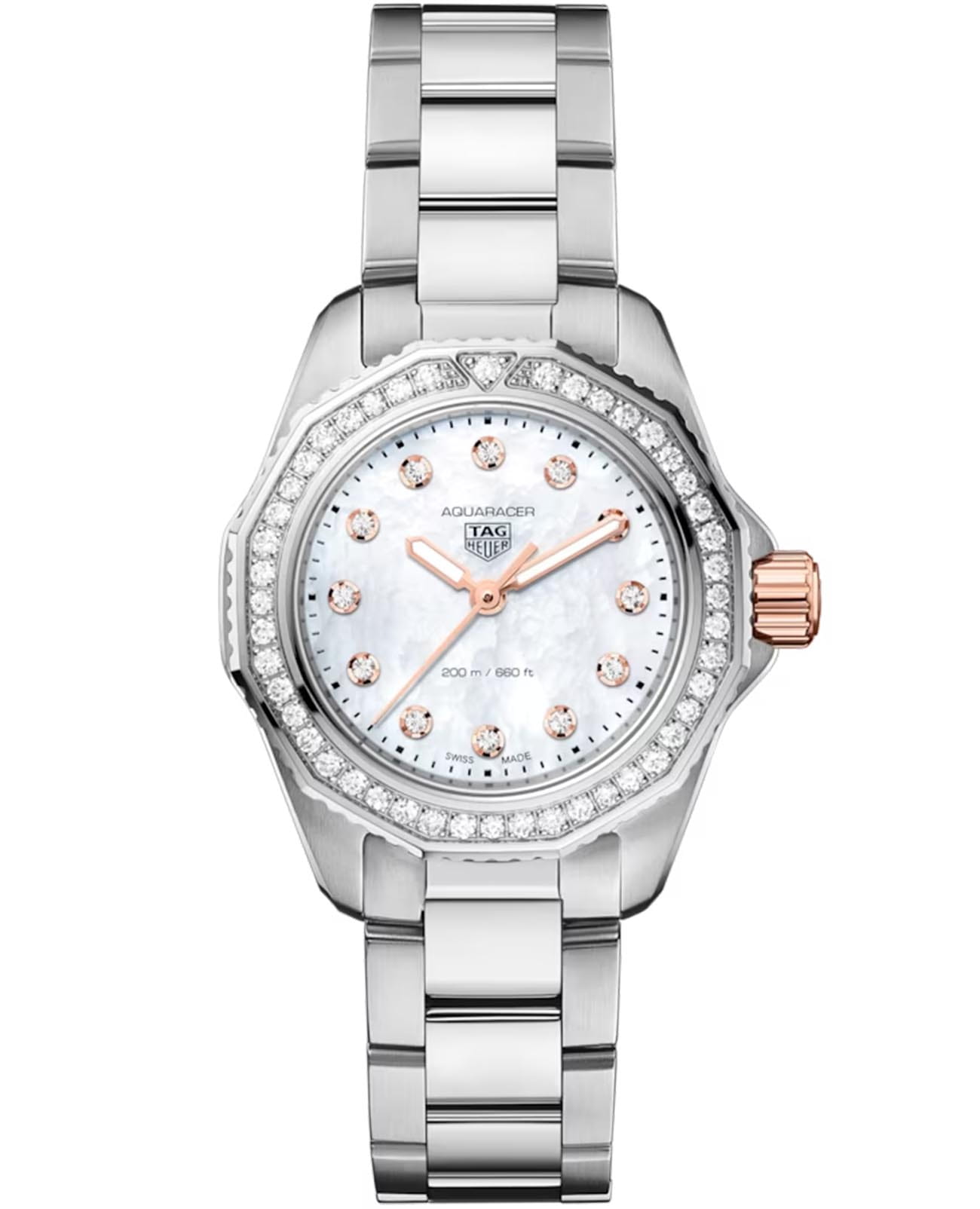 Женские швейцарские наручные кварцевые часы TAG Heuer Aquaracer Professional WBP1451.BA0622. Сапфировое стеклоСапфировое стеклоПрочный и надёжный материал из кристалла сапфира синтетического происхождения, характеризующийся особой твёрдостью и устойчивостью к царапинам и повреждениям. устойчивое к появлению царапин, обладающее высокой прозрачностью. Стрелки и метки с люминесцентным покрытиемЛюминесцентное покрытиеПозволяет считывать показания времени в темноте. Производители наносят на стрелки, часовые индексы, безель или поверхность циферблата светонакопительный состав, дающий холодное свечение.. Класс водозащиты: 200 метров, позволит плавать, нырять и заниматься другими водными видами спорта. Корпус часов изготовлен из нержавеющей стали. Браслет с раскладной застёжкойРаскладная застёжкаТакой тип застёжки используется только на браслетах из металла. Она никогда не раскрывается полностью, происходит разделение на 2 и более частей. Раскладывающая застёжка снизит вероятность потери часов к минимуму.. Вращающийся стальной безельБезельВнешний ободок, закрепляющий стекло. В спортивных часах так называется поворотное кольцо с делениями на циферблате, выполняет роль таймера – замеряет отрезки времени на шкале. Неподвижный безель – элемент декора. Однонаправленно вращающийся безель на дайверских часах позволяет фиксировать моменты погружения и выныривания на поверхность. и циферблат инкрустированы бриллиантами.