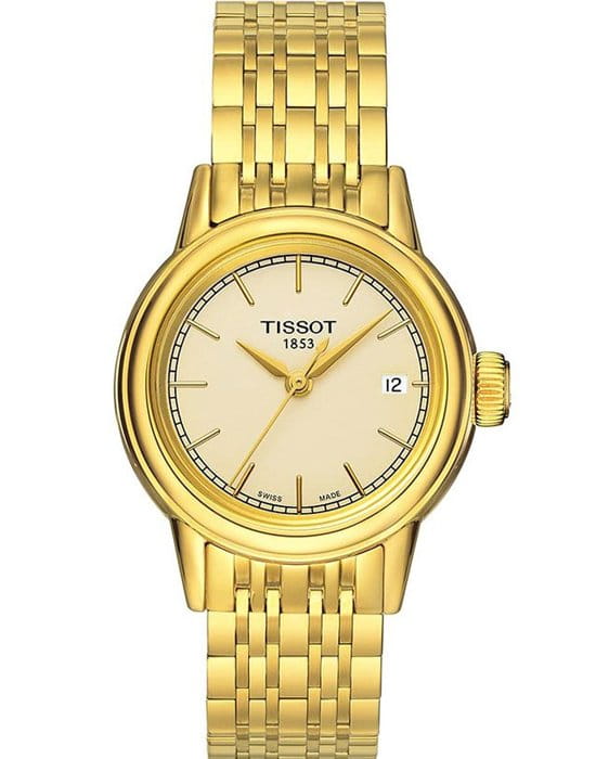 TISSOT T0852103302100 T-Classic Carson Quartz - женские кварцевые наручные часы Корпус этих часов небольшого размера (295 мм) и выполнен из нержавеющей стали L316 с PVD-покрытием цвета желтого золота Модель TISSOT T0852103302100 T-Classic Carson Quartz имеет устойчивое к царапинам сапфировое стекло, браслет из нержавеющей стали с PVD-покрытием цвета желтого золота, желтый циферблат Калибр механизма: ETA 803112 Класс водозащиты: 30 м / 3 АТМ (защита от брызг и случайных капель) Дополнительные функции и особенности: отображение числа Полная заводская комплектация TISSOT: оригинальные часы, фирменная коробка, инструкция, сервисная книжка, роман о часовой фабрике, миникаталог, замшевый фирменный чехол черного цвета для хранения и/или переноски часов, кассовый и товарный чеки Международная гарантия 2 года Производство и сборка: Швейцария