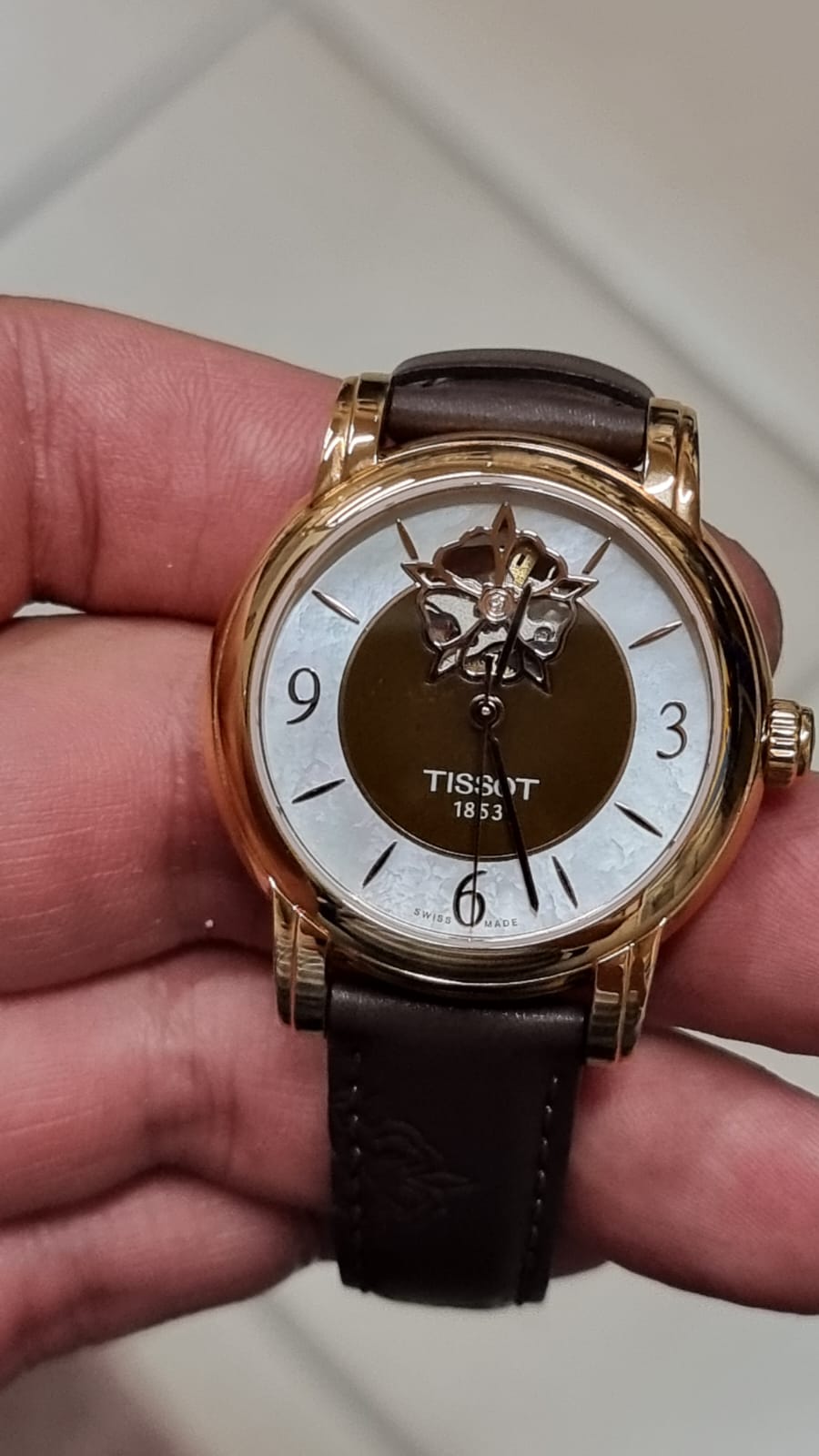 Эксклюзивный дизайн (окошко в виде цветка, через который виден механизм). Запас хода до 80 часов. Перламутровый циферблат.