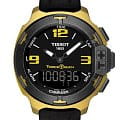 TISSOT T0814209705707 Touch Collection T-Race - мужские кварцевые наручные часы Корпус этих часов среднего размера (4215 мм) и выполнен из алюминия с PVD-покрытием цвета желтого золота Модель TISSOT T0814209705707 Touch Collection T-Race имеет устойчивое к царапинам сапфировое стекло, ремешок из натурального каучука черного цвета, черный циферблат Калибр механизма: ETA E49301 Класс водозащиты: 100 м / 10 АТМ (разрешается плавание и ныряние без акваланга) Дополнительные функции и особенности: отображение числа, полностью автоматический календарь, второе время (GMT), будильник, хронограф (секундомер), таймер (обратный отсчет), отображение данных о приливах и отливах, компас, сенсорный дисплей Полная заводская комплектация TISSOT: оригинальные часы, фирменная коробка, инструкция, сервисная книжка, роман о часовой фабрике, миникаталог, замшевый фирменный чехол черного цвета для хранения и/или переноски часов, кассовый и товарный чеки Международная гарантия 2 года Производство и сборка: Швейцария