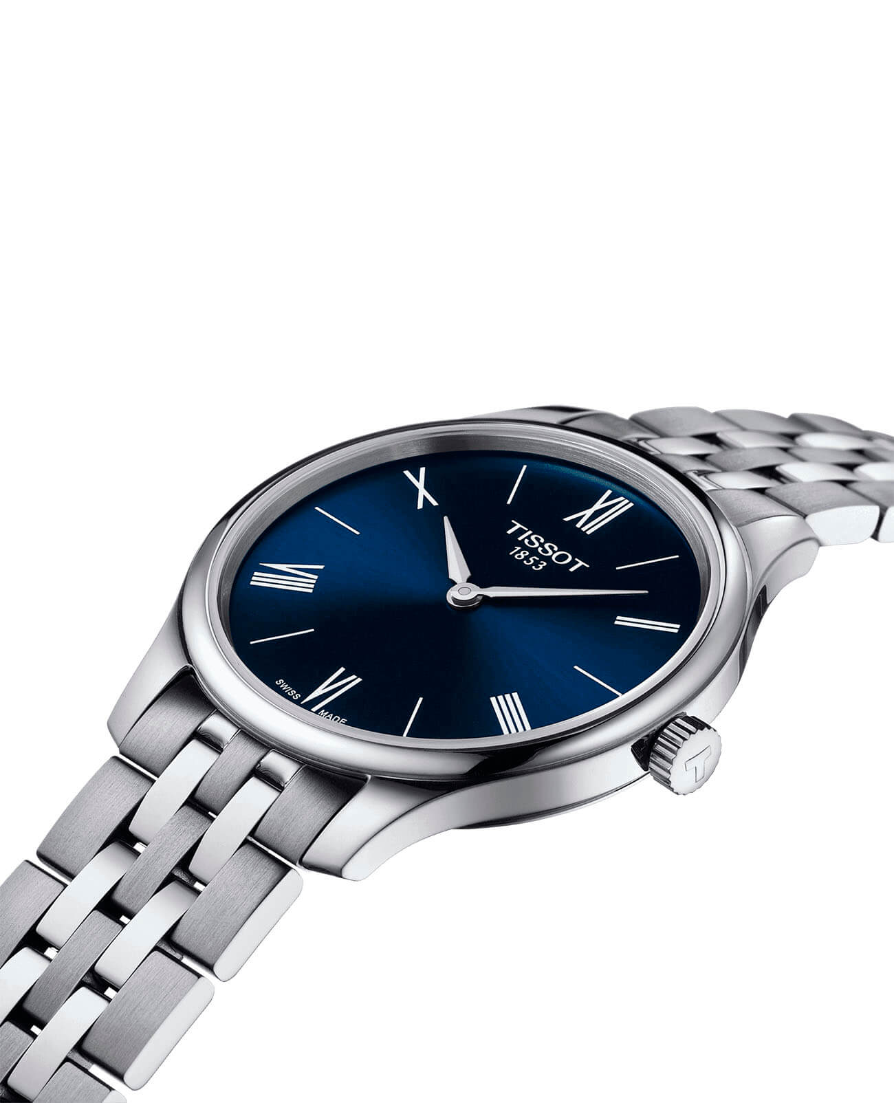 Синий циферблат, дополненный винтажными римскими цифрами, идеально смотрится в сочетании с серебристым отливом корпуса (самый тонкий из всех аксессуаров Tissot - толщина 5,5 мм) из нержавеющей стали 316L. Лаконичное оформление. Кварцевый высокоточный механизм ETA E61.031. Сапфировое стекло невозможно поцарапать. Водостойкость при давлении 3 бар. . Габариты: 31 x 31 x 5,5 мм.