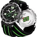 TISSOT - мужские кварцевые наручные часы Корпус этих часов крупного размера (453 мм) и выполнен из нержавеющей стали L316 PVD-покрытием черного цвета Модель имеет устойчивое к царапинам сапфировое стекло, ремешок из натурального каучука черного цвета, черный циферблат Калибр механизма: ETA G10211 Класс водозащиты: 100 м / 10 АТМ (разрешается плавание и ныряние без акваланга) Дополнительные функции и особенности: отображение числа, хронограф (секундомер), тахиметр