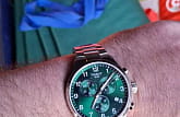Ярко-зеленый циферблат сразу бросается в глаза, три дополнительных счётчика привносят в общий облик модели спортивный стиль. Наручные часы изготовлены из нержавеющей стали, тяжесть материала приятно ощущается на запястье и не доставляет неудобств. Кварцевый механизм ETA G10.212. Люминесцентное покрытиеЛюминесцентное покрытиеПозволяет считывать показания времени в темноте. Производители наносят на стрелки, часовые индексы, безель или поверхность циферблата светонакопительный состав, дающий холодное свечение. . Высокие показатели водозащиты - 10 бар. Габариты: 45 x 45 x 11 мм.