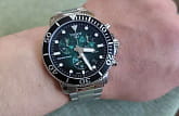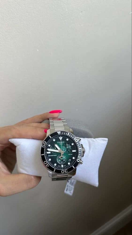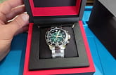 На фоне серебристого браслета и темного безеляБезельВнешний ободок, закрепляющий стекло. В спортивных часах так называется поворотное кольцо с делениями на циферблате, выполняет роль таймера – замеряет отрезки времени на шкале. Неподвижный безель – элемент декора. Однонаправленно вращающийся безель на дайверских часах позволяет фиксировать моменты погружения и выныривания на поверхность. ярко выделяется зеленый циферблат, отлично видны серебристые стрелки и часовые метки с люминесцентным покрытиемЛюминесцентное покрытиеПозволяет считывать показания времени в темноте. Производители наносят на стрелки, часовые индексы, безель или поверхность циферблата светонакопительный состав, дающий холодное свечение.. Кварцевые часы оснащены батареей Renata 394. Завинчивающиеся кнопки, головка, прозрачная задняя крышка. Сапфировое стекло. Апертура даты. Габариты: 43 x 43 x 12,7 мм.