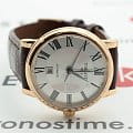 Изяществом привлекает минималистичным циферблатом с римскими цифрами, золотистого оттенка удалось добиться за счёт PVD-покрытияPVDУльтратонкое покрытие наносится в технике вакуумного напыления, сочетает в себе нитрид титана особой прочности со слоем золота или оксида хрома. Несёт в себе декоративную или защитную функцию.. Классическое исполнение модели придётся по душе девушкам, желающим приобрести универсальный аксессуар на все случаи жизни. Это часы с автоматической системой завода от движений руки владелицы, они оснащены швейцарским автоматическим механизмом ETA 2671 с запасом хода до 38 часов. Движение деталей можно просматривать через прозрачную заднюю крышку. Гладкий стальной безельБезельВнешний ободок, закрепляющий стекло. В спортивных часах так называется поворотное кольцо с делениями на циферблате, выполняет роль таймера – замеряет отрезки времени на шкале. Неподвижный безель – элемент декора. Однонаправленно вращающийся безель на дайверских часах позволяет фиксировать моменты погружения и выныривания на поверхность. удерживает сапфировое стекло, устойчивое к царапинам. Ремешок из натуральной опойковой кожи имеет тиснение под кожу крокодила. Степень водостойкости - WR 50. Габариты: 30 x 30 x 9,5 мм.