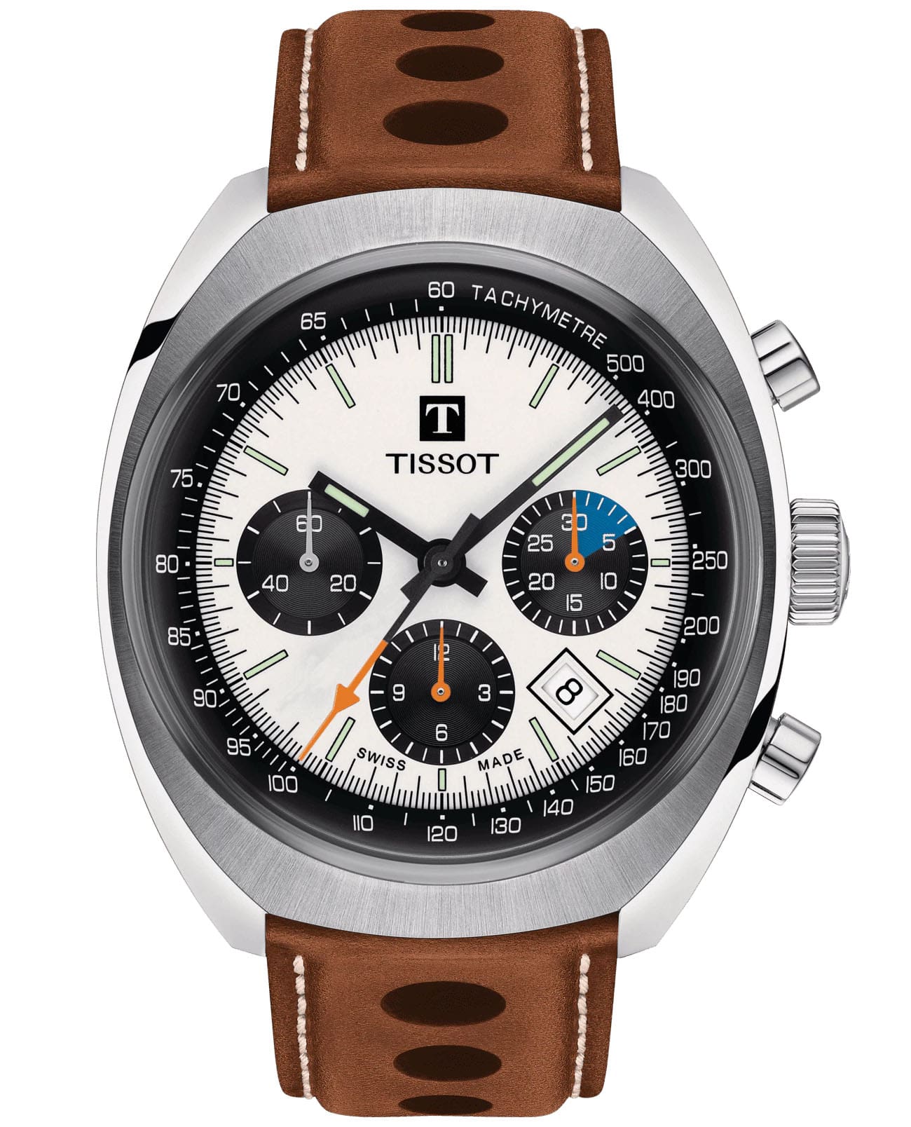 Наручные часы с оранжевыми деталями возрождают аксессуар Tissot Navigator 1973 года, спортивный хронографХронографФункция позволяет измерять отрезки времени с особой точностью: часы, минуты, секунды. Верным признаком хронографа является наличие на циферблате 3 дополнительных окошек-счётчиков. символизирует историческое партнёрство швейцарского бренда и автогоночной команды Kessel Classics. Модель выполнена в винтажном стиле, практически весь корпус матовый, исключение составляет передняя скошенная полированная поверхность. Часы оснащаются престижным автоматическим механизмом VALJOUX A05.H31 с запасом хода 60 часов и отделкой ротора женевские волны. Прозрачная задняя крышка. Коричневый ремешок с перфорацией из натуральной кожи. . Стекло из сапфира с антибликовой поверхностью. Секундомер, отображение числа. Габариты: 46,6 x 43 x 14,8 мм.