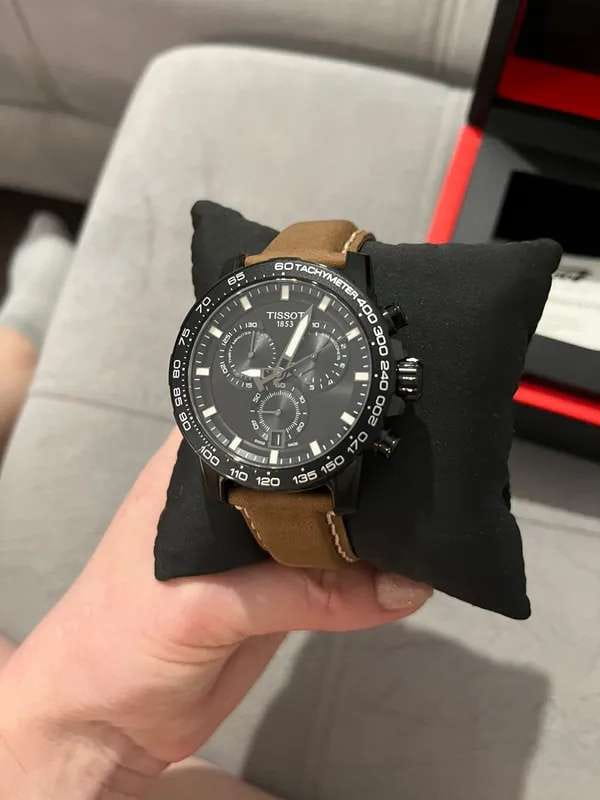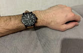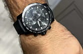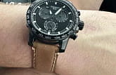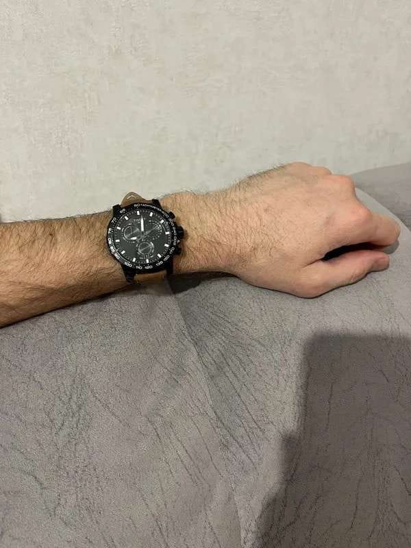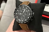 Современный хронографХронографФункция позволяет измерять отрезки времени с особой точностью: часы, минуты, секунды. Верным признаком хронографа является наличие на циферблате 3 дополнительных окошек-счётчиков. поможет подчеркнуть продуманный образ делового мужчины. Модель выполнена в спокойной тёмной расцветке. Спортивный дух выражается в коричневом ремешке из натуральной кожи с прострочкой, чёрном безелеБезельВнешний ободок, закрепляющий стекло. В спортивных часах так называется поворотное кольцо с делениями на циферблате, выполняет роль таймера – замеряет отрезки времени на шкале. Неподвижный безель – элемент декора. Однонаправленно вращающийся безель на дайверских часах позволяет фиксировать моменты погружения и выныривания на поверхность. со шкалой тахиметраТахиметрРазмеченная шкала, располагается на ободке или безеле часов. Тахиметр позволяет рассчитать скорость на определённом участке пути, расстояние измеряется в километрах или милях.. Наручные часы функционируют благодаря швейцарскому кварцевому механизму ETA G10.212. Калибр отличается максимальной точностью хода. Стекло из сапфира. Водостойкость 100 метров. Надёжный корпус из антикоррозионной стали 316L с чёрным PVD-покрытиемPVDУльтратонкое покрытие наносится в технике вакуумного напыления, сочетает в себе нитрид титана особой прочности со слоем золота или оксида хрома. Несёт в себе декоративную или защитную функцию.. Люминесцентная подсветкаЛюминесцентное покрытиеПозволяет считывать показания времени в темноте. Производители наносят на стрелки, часовые индексы, безель или поверхность циферблата светонакопительный состав, дающий холодное свечение. стрелок и индексов. Секундомер, отображение даты. Диаметр корпуса: 45,5 мм.