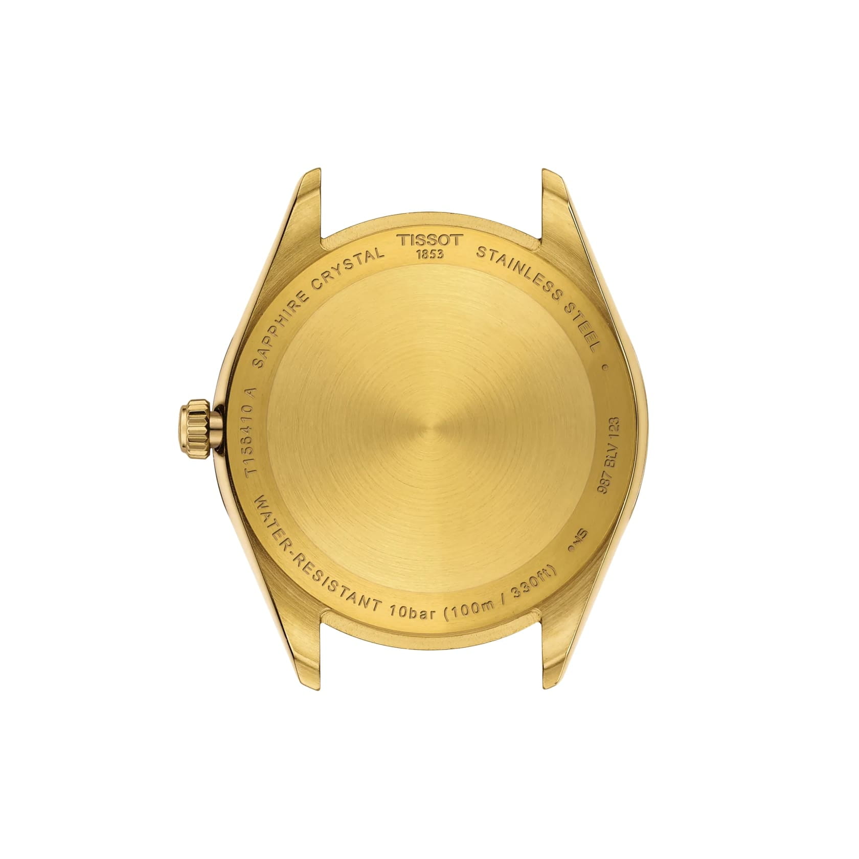 Часы Tissot Ballade T156.410.33.051.00 — это утончённое сочетание классического дизайна и современных технологий. Корпус диаметром 40 мм выполнен из нержавеющей стали с изысканным PVD-покрытиемPVDУльтратонкое покрытие наносится в технике вакуумного напыления, сочетает в себе нитрид титана особой прочности со слоем золота или оксида хрома. Несёт в себе декоративную или защитную функцию. жёлтого золота. Рифлёный безельБезельВнешний ободок, закрепляющий стекло. В спортивных часах так называется поворотное кольцо с делениями на циферблате, выполняет роль таймера – замеряет отрезки времени на шкале. Неподвижный безель – элемент декора. Однонаправленно вращающийся безель на дайверских часах позволяет фиксировать моменты погружения и выныривания на поверхность. подчёркивает элегантность модели, а сапфировое стеклоСапфировое стеклоПрочный и надёжный материал из кристалла сапфира синтетического происхождения, характеризующийся особой твёрдостью и устойчивостью к царапинам и повреждениям. с антибликовым покрытием защищает циферблат от царапин.