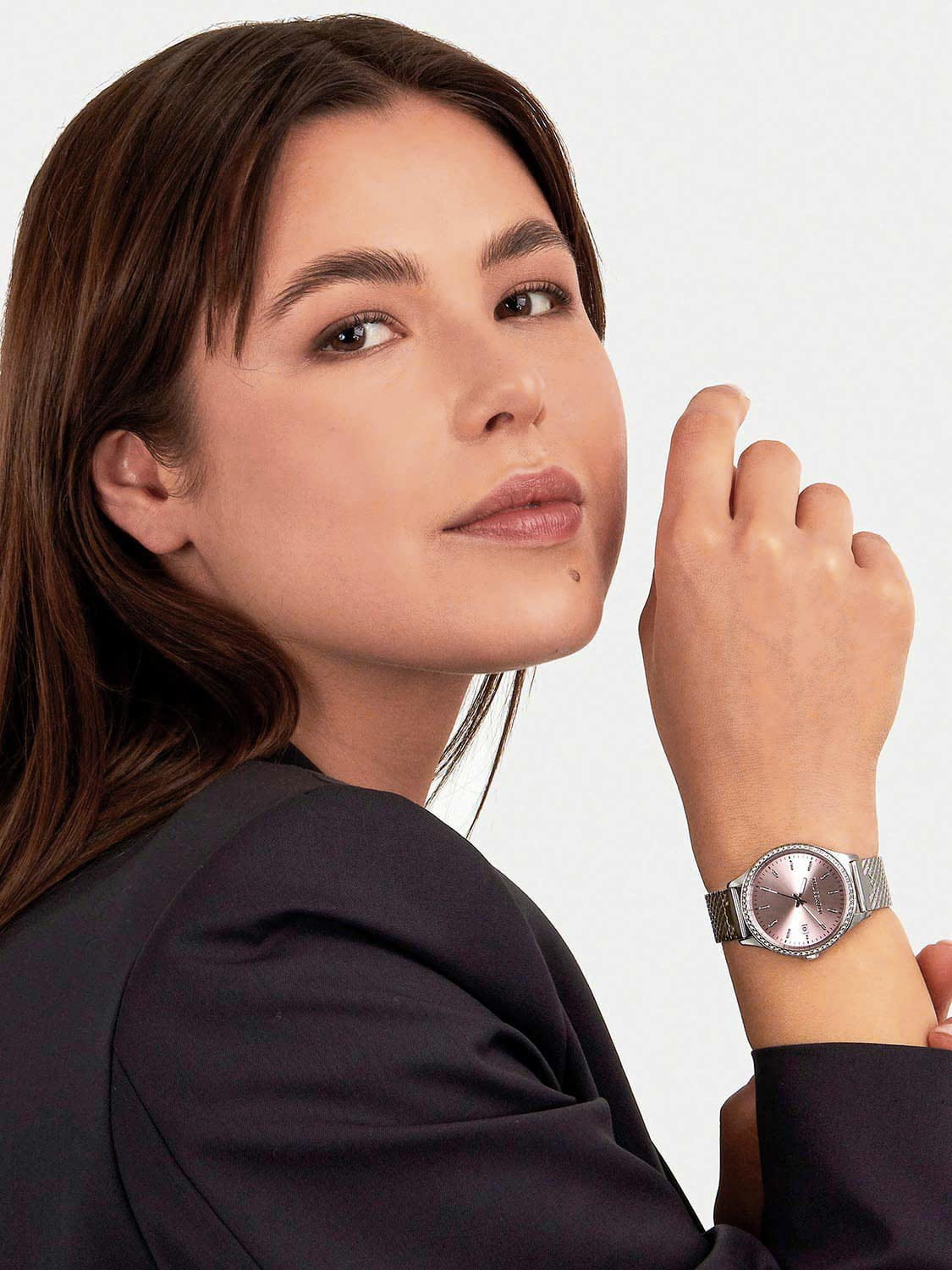 Итальянские женские часы Trussardi T-Vision R2453170506 - это стильный женский аксессуар, который сочетает элегантный дизайн и практичность. Корпус выполнен из нержавеющей стали, что обеспечивает долговечность и утончённый внешний вид. Надежное минеральное стеклоМинеральное стеклоМинеральное стекло представляет собой искусственно выращенный минерал кварца. Такое стекло отличается особой устойчивостью к повреждениям и царапинам. Уступает по некоторым качествам сапфировому стеклу. защищает циферблат от царапин и обеспечивает долговечность. Корпус и циферблат украшены кристаллами. Модель оснащена кварцевым механизмом, обеспечивающим высокую точность хода. Окошко даты в положении 3 часов. Браслет из нержавеющей стали с раскладным замкомРаскладной замокДанный вариант застежки используется только на часах с металлическим браслетом. Отличительная особенность такого крепления в том, что длина браслета становится универсальной и вы можете самостоятельно отрегулировать нужный вам размер – застежка просто двигается по браслету часов. обеспечивает комфортное ношение. Стрелки оснащены люминесцентным покрытиемЛюминесцентное покрытиеПозволяет считывать показания времени в темноте. Производители наносят на стрелки, часовые индексы, безель или поверхность циферблата светонакопительный состав, дающий холодное свечение., обеспечивающим отличную видимость даже при слабом освещении. Водозащита 50 метров позволит защитить корпус от случайных брызг или капель дождя. Эта модель – отличный выбор для тех, кто ищет сочетание стиля, качества и функциональности. Часы станут не только полезным аксессуаром, но и выразительным элементом вашего имиджа.