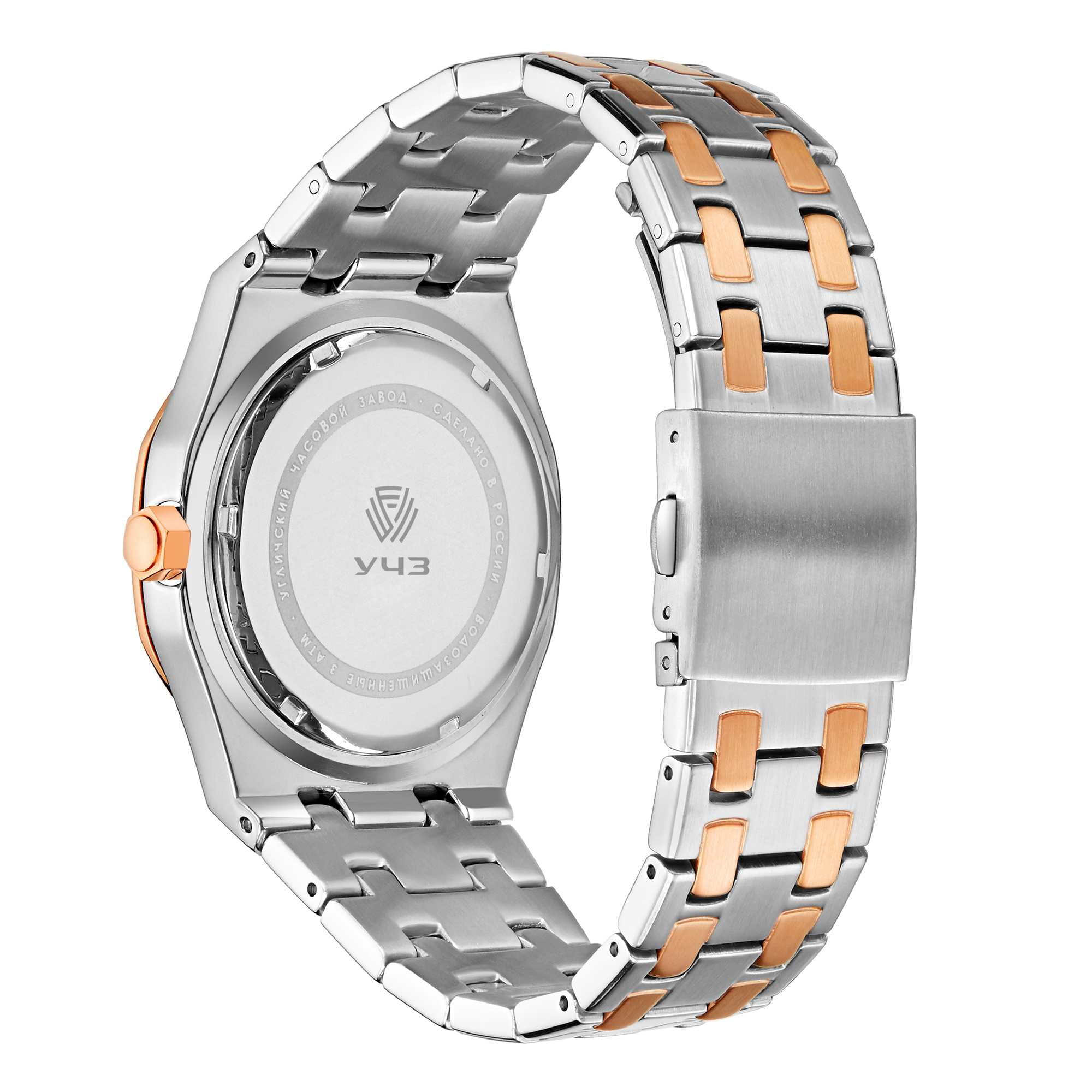 УЧЗ Spectr 1514A5B5 — стильные мужские часы, сочетающие динамичный дизайн и чёткую функциональность для ежедневной носки. Круглый корпус выполнен из стали с безелемБезельВнешний ободок, закрепляющий стекло. В спортивных часах так называется поворотное кольцо с делениями на циферблате, выполняет роль таймера – замеряет отрезки времени на шкале. Неподвижный безель – элемент декора. Однонаправленно вращающийся безель на дайверских часах позволяет фиксировать моменты погружения и выныривания на поверхность. c IP-покрытиемIP-покрытиеМетод ионного напыления. Демонстрирует повышенную устойчивость к истиранию, окислению и химическим веществам. Под воздействием высокого давления и температуры около 1500°C молекулы металла надёжно соединяются с частицами корпуса часов., размером 41 мм, поставляются со стальным браслетом на раскладной застёжкеРаскладная застёжкаТакой тип застёжки используется только на браслетах из металла. Она никогда не раскрывается полностью, происходит разделение на 2 и более частей. Раскладывающая застёжка снизит вероятность потери часов к минимуму.. Черный циферблат с акцентными стрелками и штрихами с люминесцентным покрытиемЛюминесцентное покрытиеПозволяет считывать показания времени в темноте. Производители наносят на стрелки, часовые индексы, безель или поверхность циферблата светонакопительный состав, дающий холодное свечение. делает модель более практичной. Окошко даты вынесено в положении 3 часов. Минеральное стеклоМинеральное стеклоМинеральное стекло представляет собой искусственно выращенный минерал кварца. Такое стекло отличается особой устойчивостью к повреждениям и царапинам. Уступает по некоторым качествам сапфировому стеклу. для защиты от мелких повреждений, а кварцевый механизм обеспечивает высокую точность. Водозащита до 30 метров, благодаря чему корпус защищён от брызг воды и дождя. Идеальный выбор для тех, кто ценит элегантный дизайн и качество.