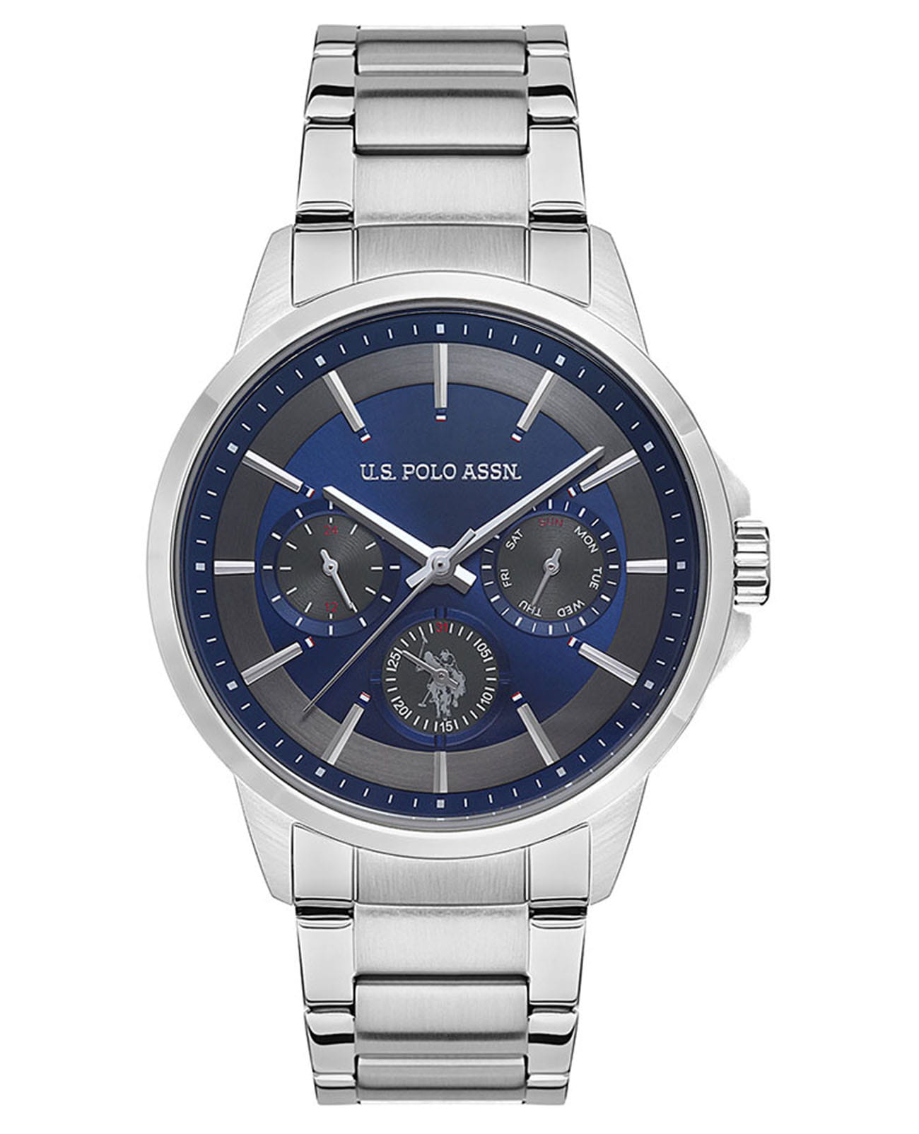Мужские часы U.S. Polo Assn. Crossing USPA1000-03, кварцевый механизм с высокой точностью. Минеральное стеклоМинеральное стеклоМинеральное стекло представляет собой искусственно выращенный минерал кварца. Такое стекло отличается особой устойчивостью к повреждениям и царапинам. Уступает по некоторым качествам сапфировому стеклу. устойчивое к появлению царапин, обладающее высокой прозрачностью. Корпус и браслет изготовлены из нержавеющей стали. На циферблате три дополнительных индикатора. Центральные часовая, минутная и секундная стрелки. Индикация даты и дня недели. 12/24х часовой формат времени. Класс водозащиты: 50 метров, позволит защитить корпус от случайных брызг или капель дождя. Стальной браслет на застёжке «бабочка» с кнопкамиЗастёжка "бабочка"Такой вид застёжки дополняется предохранителями, помогающими избежать случайного раскрытия браслета. Обладают изящным исполнением. .