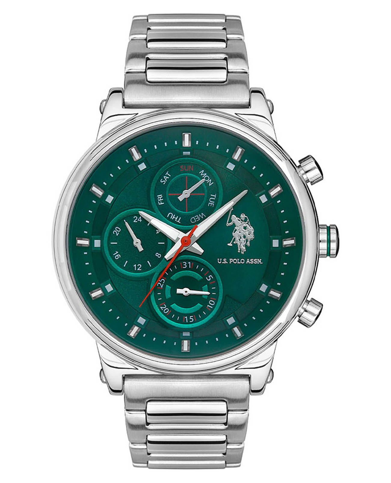 Мужские часы часы U.S. Polo Assn. Crossing USPA1008-10, кварцевый механизм с высокой точностью. Минеральное стеклоМинеральное стеклоМинеральное стекло представляет собой искусственно выращенный минерал кварца. Такое стекло отличается особой устойчивостью к повреждениям и царапинам. Уступает по некоторым качествам сапфировому стеклу. устойчивое к появлению царапин, обладающее высокой прозрачностью. Центральные часовая, минутная и секундная стрелки. Индикация даты и дня недели. 12/24х часовой формат времени. Корпус и браслет изготовлены из нержавеющей стали. На циферблате три дополнительных индикатора. Стрелки и метки с люминесцентным покрытиемЛюминесцентное покрытиеПозволяет считывать показания времени в темноте. Производители наносят на стрелки, часовые индексы, безель или поверхность циферблата светонакопительный состав, дающий холодное свечение.. Класс водозащиты: 50 метров, позволит защитить корпус от случайных брызг или капель дождя. Стальной браслет на раскладной застёжкеРаскладная застёжкаТакой тип застёжки используется только на браслетах из металла. Она никогда не раскрывается полностью, происходит разделение на 2 и более частей. Раскладывающая застёжка снизит вероятность потери часов к минимуму..