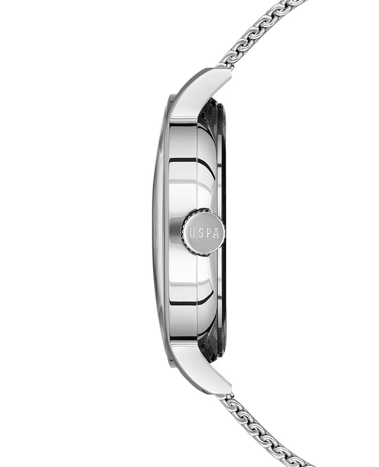 Мужские часы U.S. Polo Assn. Fundamental USPA1070-01, кварцевый механизм с высокой точностью. Минеральное стеклоМинеральное стеклоМинеральное стекло представляет собой искусственно выращенный минерал кварца. Такое стекло отличается особой устойчивостью к повреждениям и царапинам. Уступает по некоторым качествам сапфировому стеклу. устойчивое к появлению царапин, обладающее высокой прозрачностью. Корпус и браслет изготовлены из нержавеющей стали. Окошко даты в положении 3 часов. Стрелки и метки с люминесцентным покрытиемЛюминесцентное покрытиеПозволяет считывать показания времени в темноте. Производители наносят на стрелки, часовые индексы, безель или поверхность циферблата светонакопительный состав, дающий холодное свечение.. Класс водозащиты: 50 метров, позволит защитить корпус от случайных брызг или капель дождя. Стальной браслет миланского плетения на раскладной застёжкеРаскладная застёжкаТакой тип застёжки используется только на браслетах из металла. Она никогда не раскрывается полностью, происходит разделение на 2 и более частей. Раскладывающая застёжка снизит вероятность потери часов к минимуму..