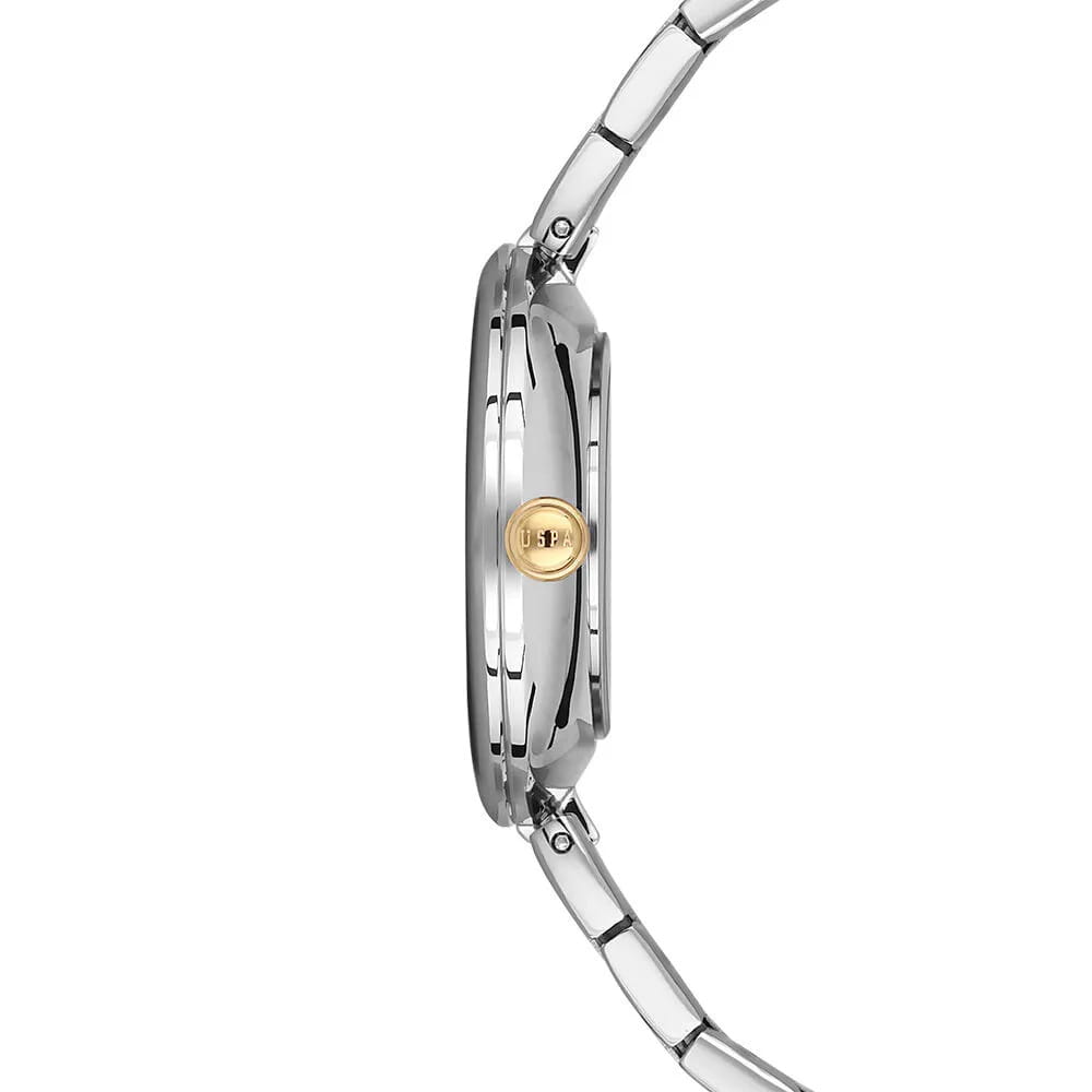 Женские элегантные часы U.S. Polo Assn. Stile USPA2015-07 кварцевый механизм с высокой точностью. Минеральное стеклоМинеральное стеклоМинеральное стекло представляет собой искусственно выращенный минерал кварца. Такое стекло отличается особой устойчивостью к повреждениям и царапинам. Уступает по некоторым качествам сапфировому стеклу. устойчивое к появлению царапин, обладающее высокой прозрачностью. Изысканный корпус изготовлен из нержавеющей стали. Лаконичные золотистые центральные часовая, минутная и секундная стрелки. Класс водозащиты: 30 метров, позволит защитить корпус от случайных брызг или капель дождя. Стальной браслет с IP-покрытиемIP-покрытиеМетод ионного напыления. Демонстрирует повышенную устойчивость к истиранию, окислению и химическим веществам. Под воздействием высокого давления и температуры около 1500°C молекулы металла надёжно соединяются с частицами корпуса часов. с раскладной застёжкойРаскладная застёжкаТакой тип застёжки используется только на браслетах из металла. Она никогда не раскрывается полностью, происходит разделение на 2 и более частей. Раскладывающая застёжка снизит вероятность потери часов к минимуму. обеспечивает комфорт и удобство в использовании, добавляя завершающий штрих к этому стильному аксессуару. Циферблат подчёркивает изысканный характер часов, создавая универсальный образ, подходящий как для повседневных ситуаций, так и для особых случаев.