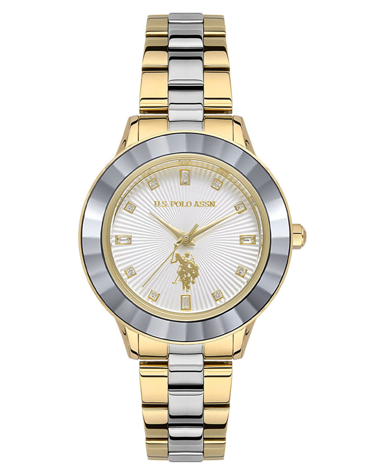 Женские часы U.S. Polo Assn. Fundamental USPA2044-06, кварцевый механизм с высокой точностью. Минеральное стеклоМинеральное стеклоМинеральное стекло представляет собой искусственно выращенный минерал кварца. Такое стекло отличается особой устойчивостью к повреждениям и царапинам. Уступает по некоторым качествам сапфировому стеклу. устойчивое к появлению царапин, обладающее высокой прозрачностью. Корпус изготовлен из нержавеющей стали с IP-покрытиемIP-покрытиеМетод ионного напыления. Демонстрирует повышенную устойчивость к истиранию, окислению и химическим веществам. Под воздействием высокого давления и температуры около 1500°C молекулы металла надёжно соединяются с частицами корпуса часов.. Граненый стеклянный безельБезельВнешний ободок, закрепляющий стекло. В спортивных часах так называется поворотное кольцо с делениями на циферблате, выполняет роль таймера – замеряет отрезки времени на шкале. Неподвижный безель – элемент декора. Однонаправленно вращающийся безель на дайверских часах позволяет фиксировать моменты погружения и выныривания на поверхность.. Метки украшены кристаллами. Класс водозащиты: 50 метров, позволит защитить корпус от случайных брызг или капель дождя. Стальной браслет с частичным IP-покрытиемIP-покрытиеМетод ионного напыления. Демонстрирует повышенную устойчивость к истиранию, окислению и химическим веществам. Под воздействием высокого давления и температуры около 1500°C молекулы металла надёжно соединяются с частицами корпуса часов. на раскладной застёжкеРаскладная застёжкаТакой тип застёжки используется только на браслетах из металла. Она никогда не раскрывается полностью, происходит разделение на 2 и более частей. Раскладывающая застёжка снизит вероятность потери часов к минимуму..
