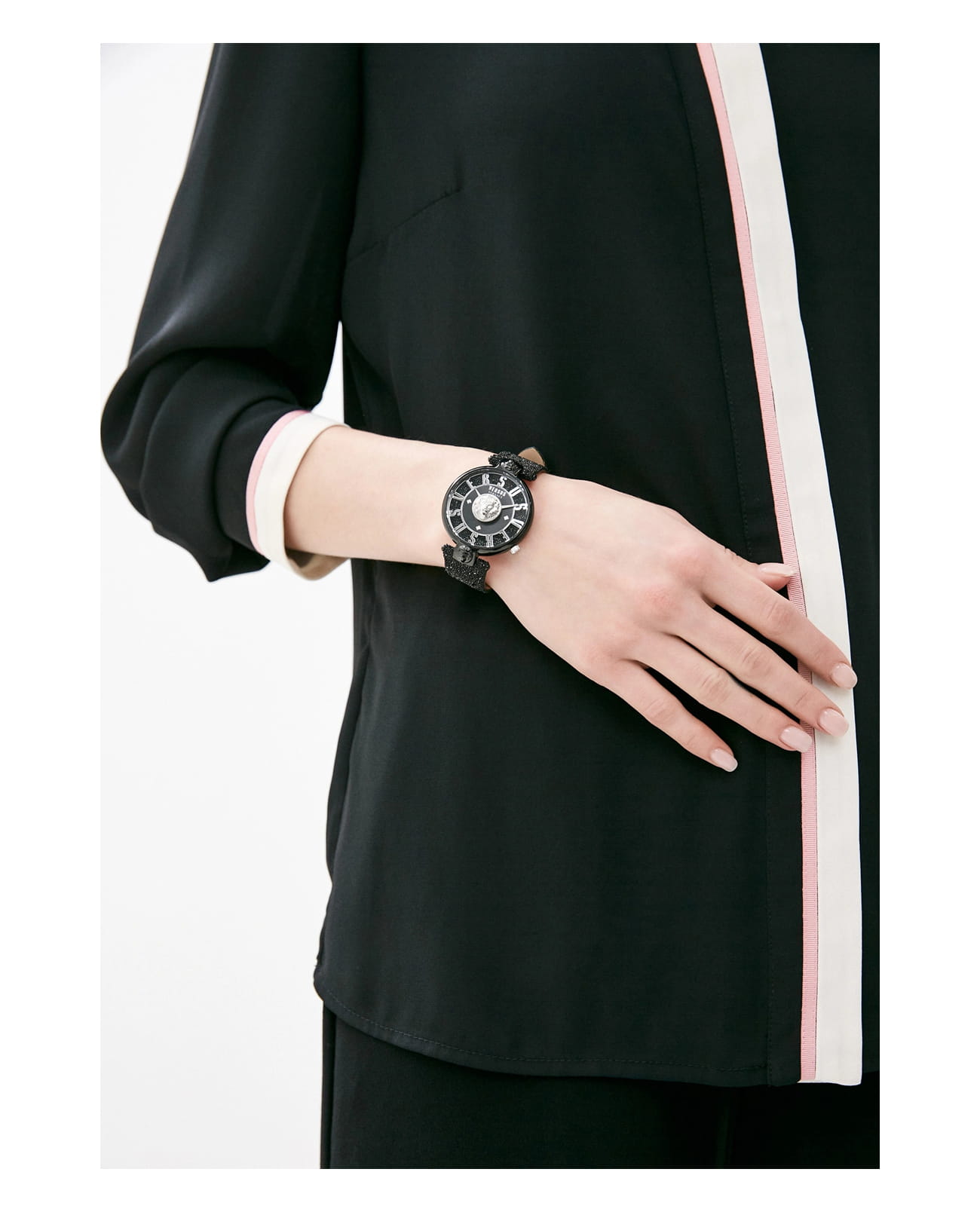 Эти эффектные дизайнерские часы станут источником восхищения, придав вашему образу еще больше загадочности. Модные женские часы Lodovica с круглым корпусом. Циферблат украшен надписью бренда и крошкой кристаллов Swarovski. Часовые метки в виде точек. В центре циферблата объемный лого в форме головы льва. Смещенная заводная головка. Стальной браслет.