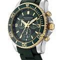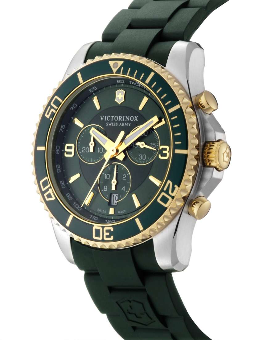 Мужские швейцарские часы Victorinox 241694 из коллекции Maverick Chronograph сочетают спортивную функциональность и элегантный дизайн. Модель представлена круглым корпусом диаметром 43 мм из нержавеющей стали 316L с частичным PVD-покрытиемPVDУльтратонкое покрытие наносится в технике вакуумного напыления, сочетает в себе нитрид титана особой прочности со слоем золота или оксида хрома. Несёт в себе декоративную или защитную функцию. в золотистом оттенке, дополненным насыщенным зеленым циферблатом. Часы оснащены высокоточным швейцарским кварцевым механизмом Ronda 5030.D с функцией хронографа (измерение до 30 минут с точностью 1/10 секунды), тахиметрической шкалой и апертурой даты. Циферблат защищен сапфировым стекломСапфировое стеклоПрочный и надёжный материал из кристалла сапфира синтетического происхождения, характеризующийся особой твёрдостью и устойчивостью к царапинам и повреждениям. с тройным антибликовым покрытием, устойчивым к царапинам, а люминесцентные стрелки Super-Luminova® обеспечивают отличную читаемость в темноте. Водонепроницаемость 10 ATM (100 метров) позволяет использовать часы для плавания и снорклинга. Однонаправленный вращающийся безель в дайверском стиле дополняет функционал модели. Резиновый ремешок зеленого цвета шириной 22 мм с классической пряжкой обеспечивает комфортную посадку на запястье.