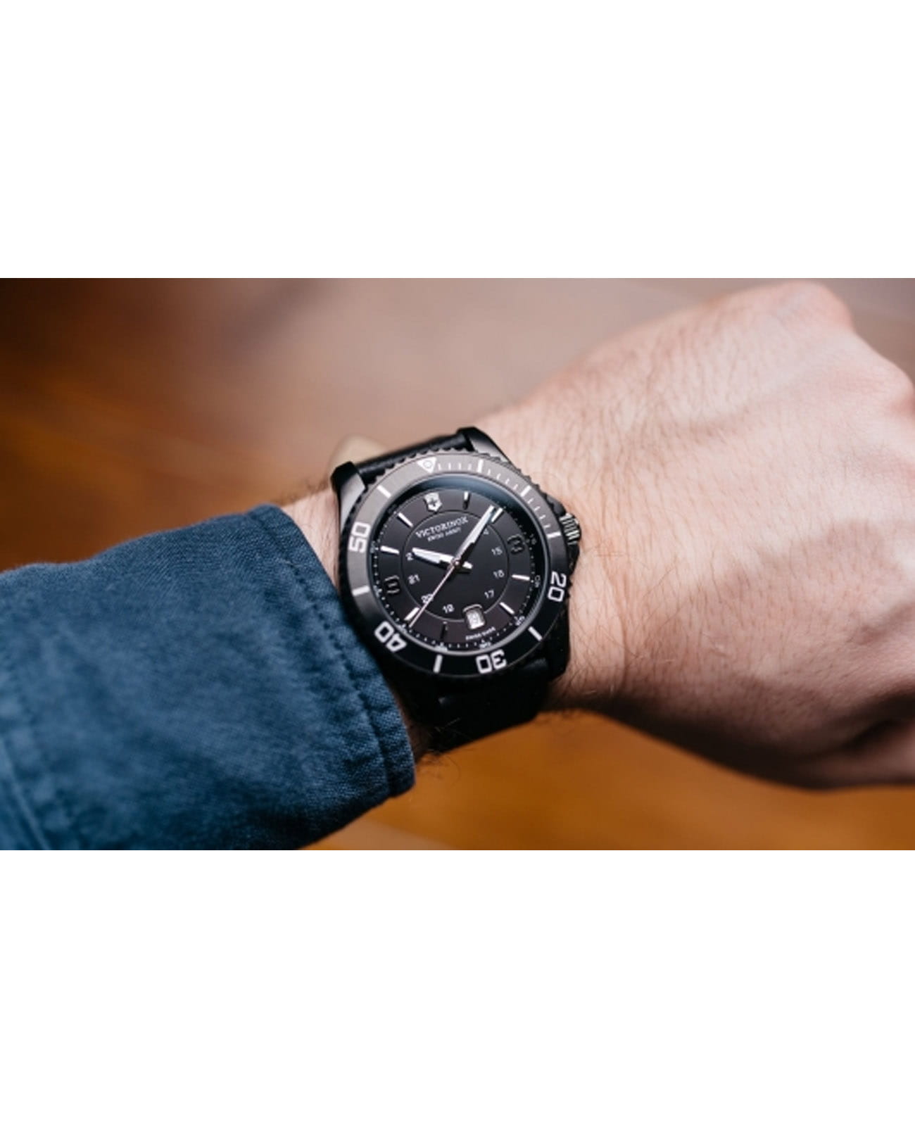 Мужские швейцарские часы Victorinox Maverick 241787, кварцевый механизм с высокой точностью. Сапфировое стеклоСапфировое стеклоПрочный и надёжный материал из кристалла сапфира синтетического происхождения, характеризующийся особой твёрдостью и устойчивостью к царапинам и повреждениям. с трёхслойным антибликовым покрытием. Корпус часов выполнен из нержавеющей стали с PVD-покрытиемPVDУльтратонкое покрытие наносится в технике вакуумного напыления, сочетает в себе нитрид титана особой прочности со слоем золота или оксида хрома. Несёт в себе декоративную или защитную функцию.. Вращающийся стальной безельБезельВнешний ободок, закрепляющий стекло. В спортивных часах так называется поворотное кольцо с делениями на циферблате, выполняет роль таймера – замеряет отрезки времени на шкале. Неподвижный безель – элемент декора. Однонаправленно вращающийся безель на дайверских часах позволяет фиксировать моменты погружения и выныривания на поверхность. с PVD-покрытиемPVDУльтратонкое покрытие наносится в технике вакуумного напыления, сочетает в себе нитрид титана особой прочности со слоем золота или оксида хрома. Несёт в себе декоративную или защитную функцию.. Окошко даты находится в положении 6 часов. Стрелки и метки с люминесцентным покрытиемЛюминесцентное покрытиеПозволяет считывать показания времени в темноте. Производители наносят на стрелки, часовые индексы, безель или поверхность циферблата светонакопительный состав, дающий холодное свечение.. Класс водозащиты: 100 метров, позволит плавать, нырять и заниматься другими водными видами спорта. Кожаный ремешок на стандартной застежке.