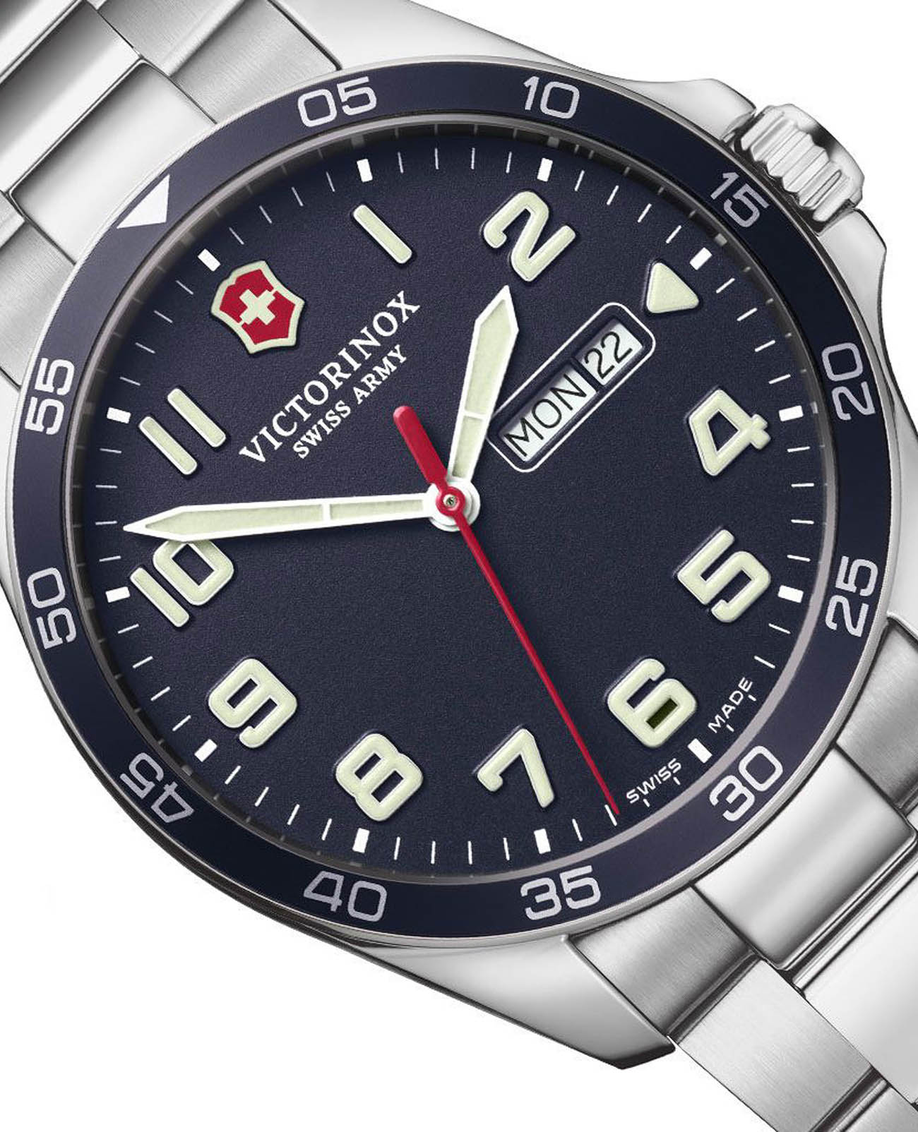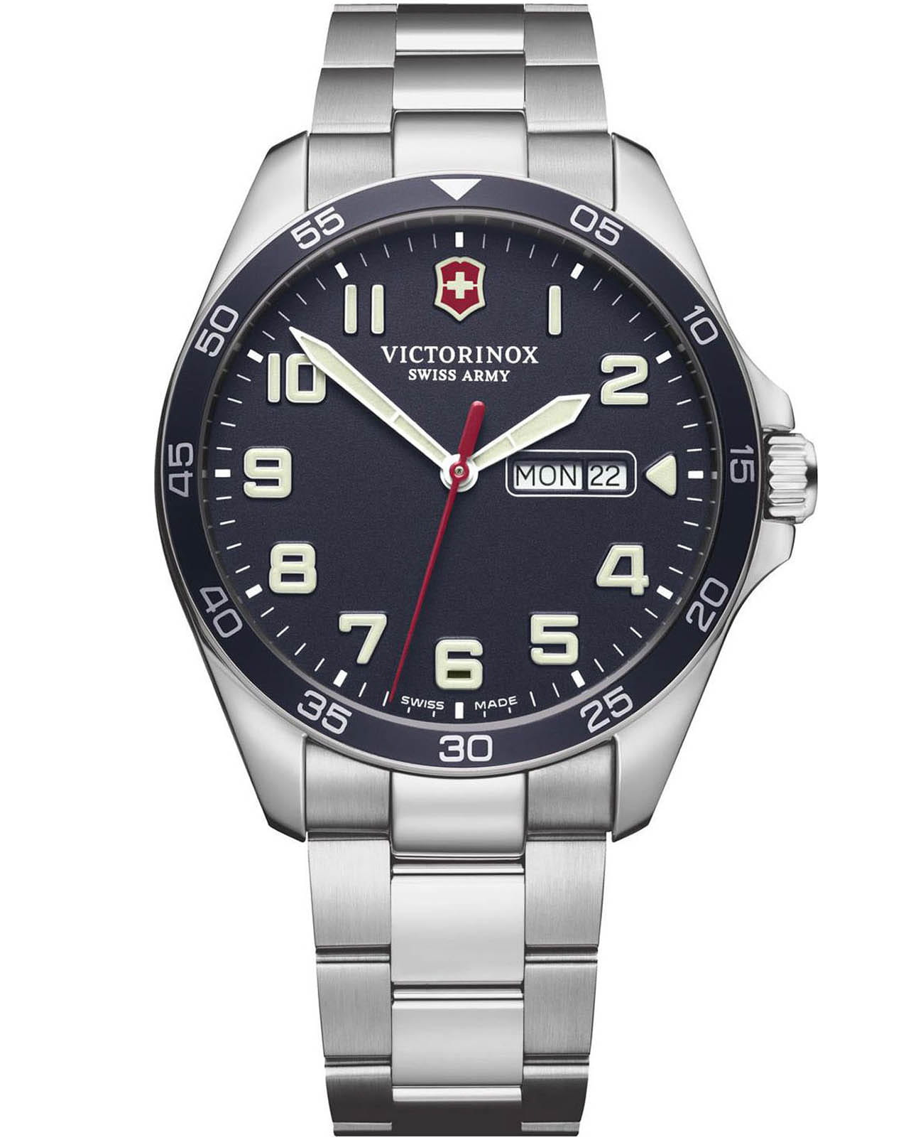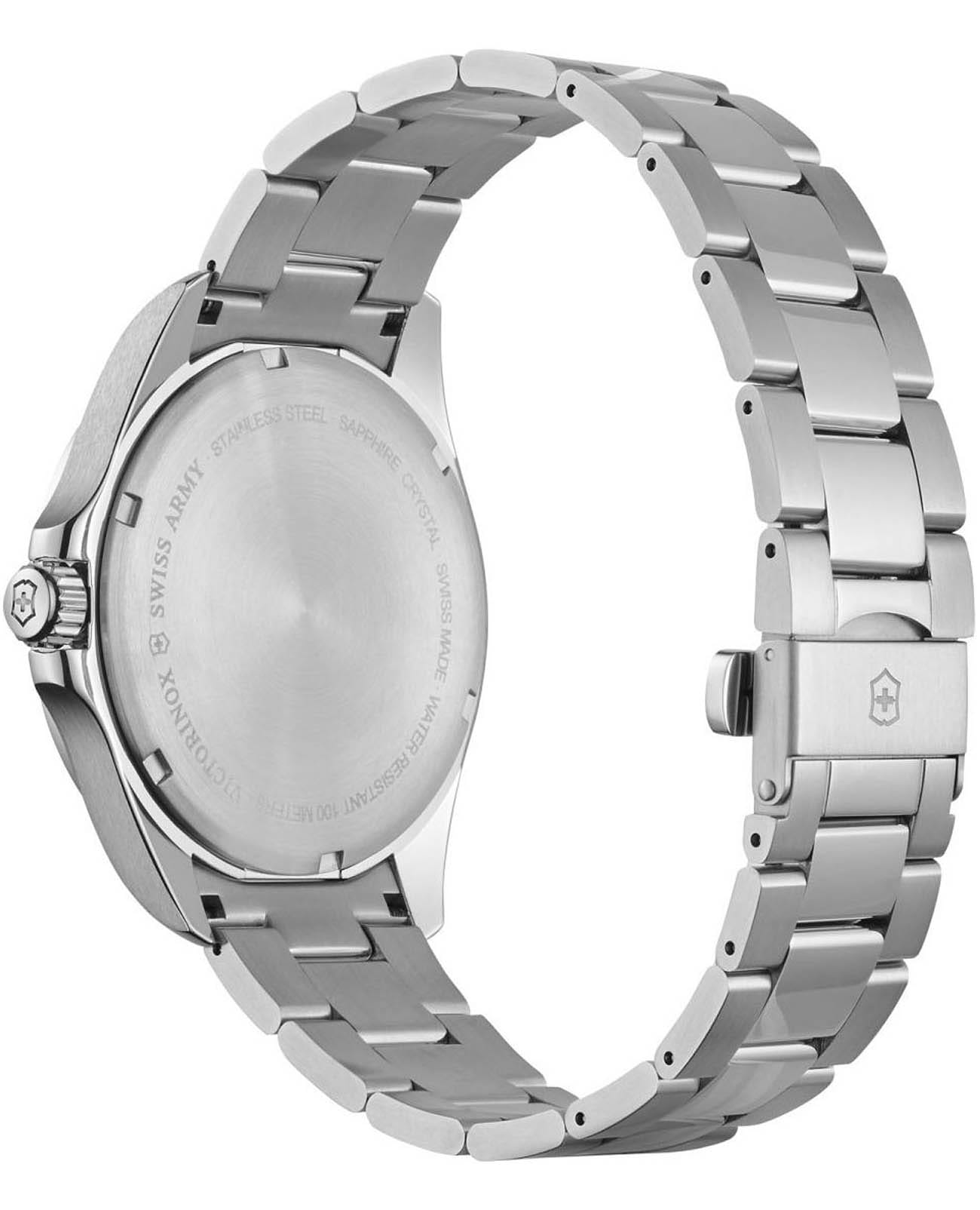Мужские наручные часы Victorinox 241851 с надежным кварцевым механизмом. Сапфировое стеклоСапфировое стеклоПрочный и надёжный материал из кристалла сапфира синтетического происхождения, характеризующийся особой твёрдостью и устойчивостью к царапинам и повреждениям. с антибликовым покрытием. Степень водозащиты: 100 метров, позволит плавать, нырять и заниматься другими водными видами спорта. Корпус и браслет часов выполнены из нержавеющей стали. Окошки дня недели и даты находятся в положении 3 часа. Стрелки и метки с люминесцентным покрытиемЛюминесцентное покрытиеПозволяет считывать показания времени в темноте. Производители наносят на стрелки, часовые индексы, безель или поверхность циферблата светонакопительный состав, дающий холодное свечение.. Стальной браслет на застёжке-бабочке с кнопкамиЗастёжка "бабочка"Такой вид застёжки дополняется предохранителями, помогающими избежать случайного раскрытия браслета. Обладают изящным исполнением. .