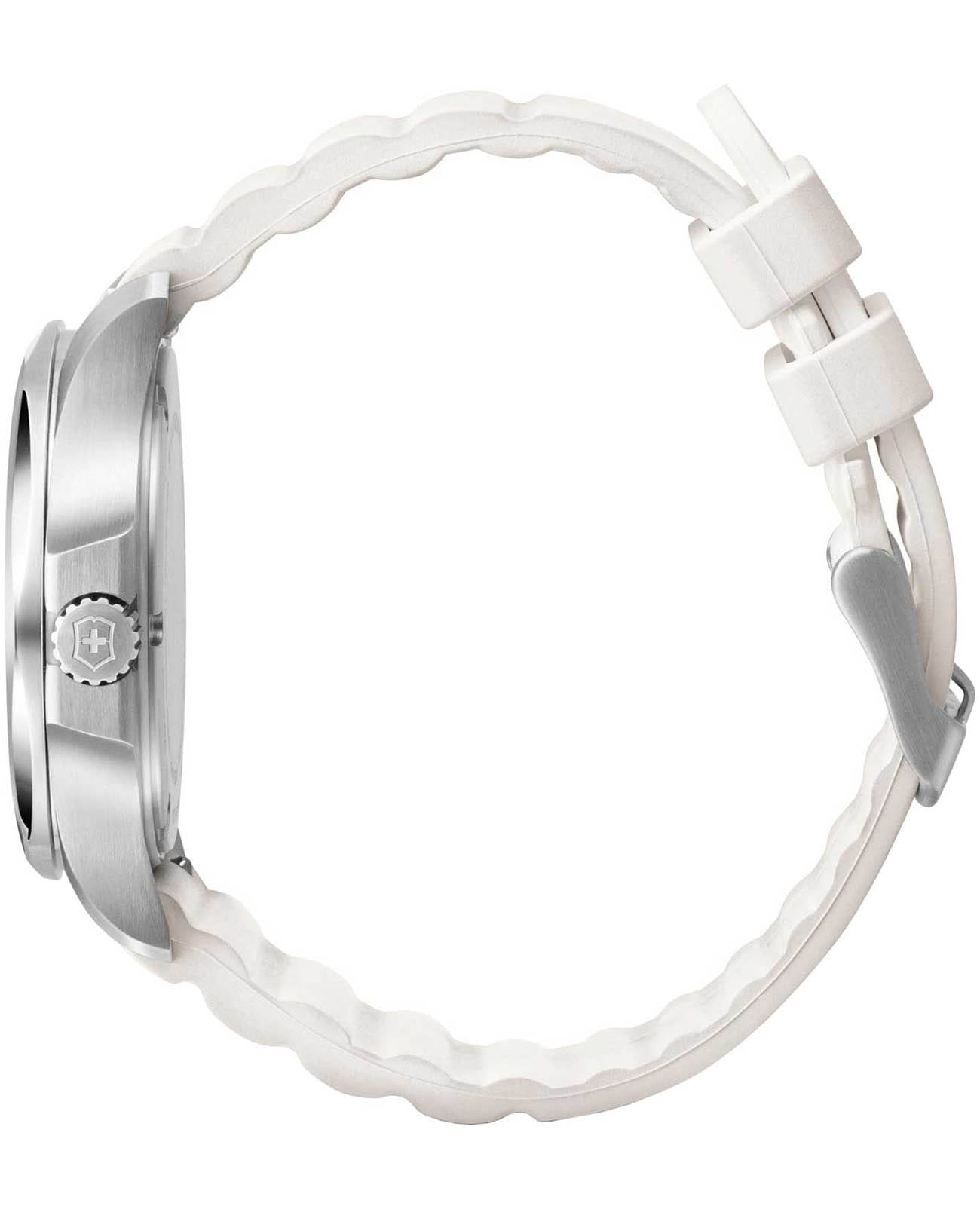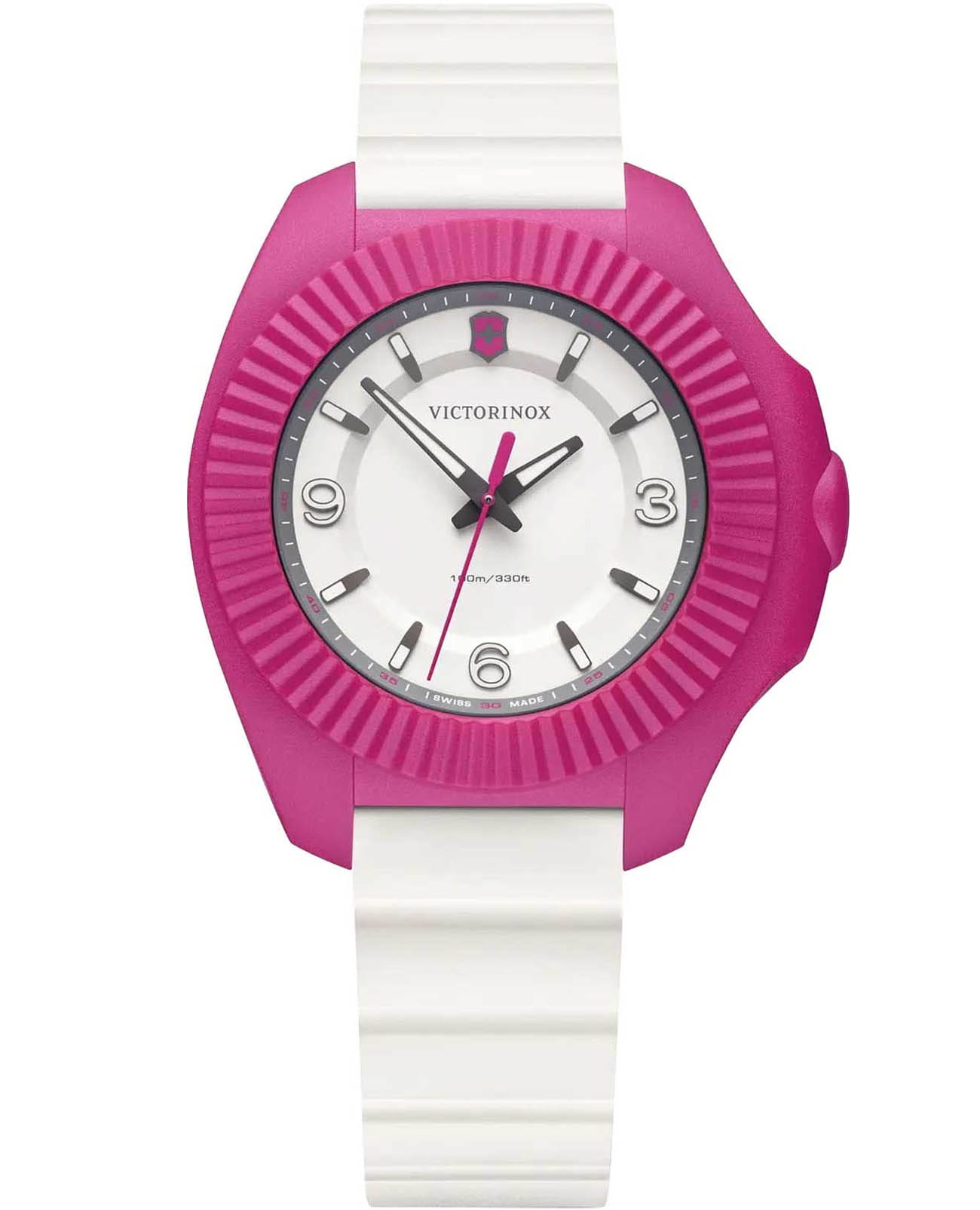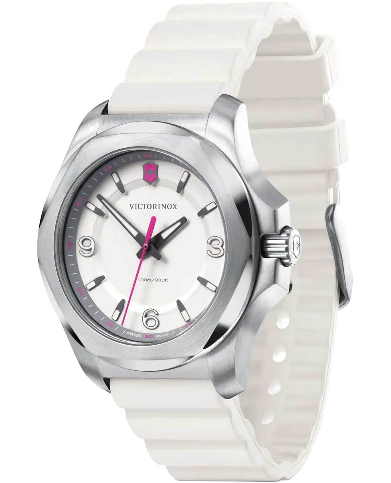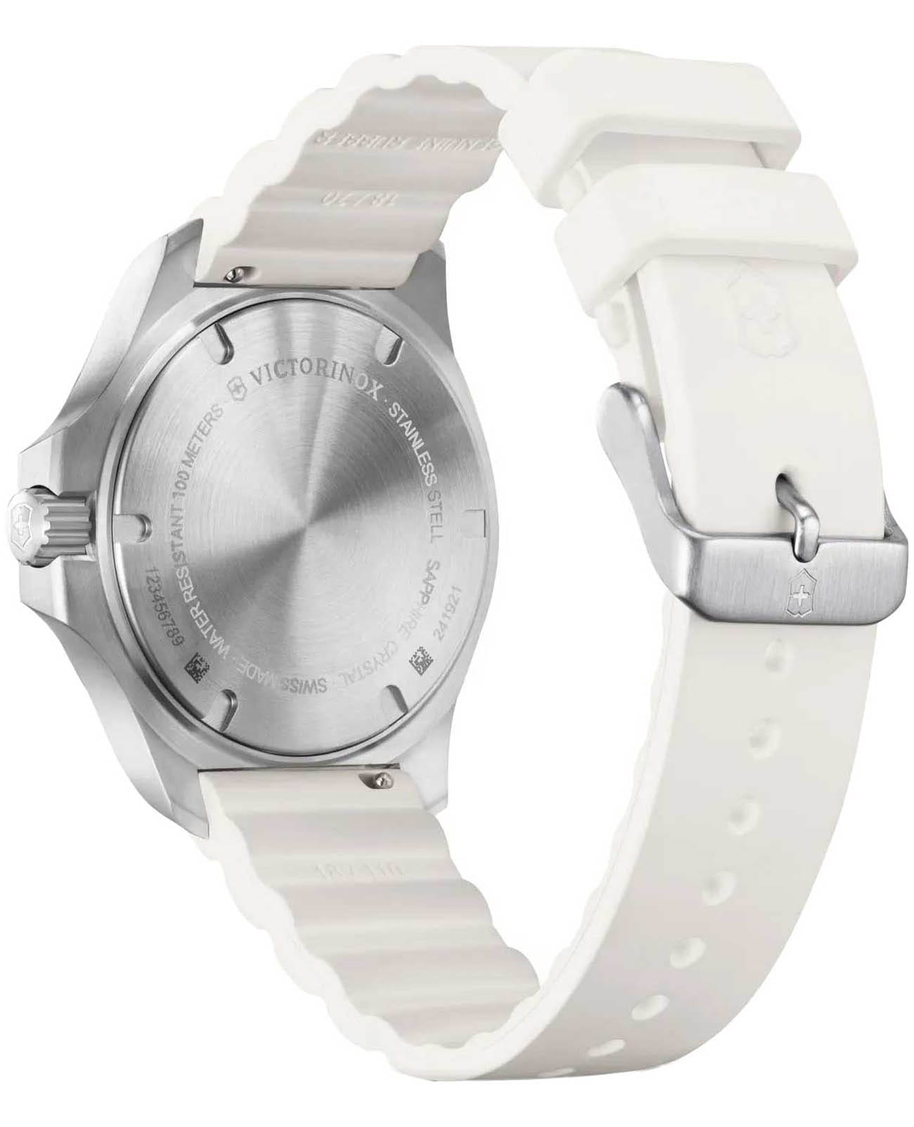 Женские швейцарские часы Victorinox I.N.O.X. V 241921. Сапфировое стеклоСапфировое стеклоПрочный и надёжный материал из кристалла сапфира синтетического происхождения, характеризующийся особой твёрдостью и устойчивостью к царапинам и повреждениям. с трёхслойным антибликовым покрытием. Корпус часов выполнен из нержавеющей стали 316L. Практичный каучуковый ремешок на стандартной застёжке. Влагозащита: 100 метров, позволит плавать, нырять и заниматься другими водными видами спорта. Стрелки и метки с люминесцентным покрытиемЛюминесцентное покрытиеПозволяет считывать показания времени в темноте. Производители наносят на стрелки, часовые индексы, безель или поверхность циферблата светонакопительный состав, дающий холодное свечение.. В комплекте съемный защитный бампер.