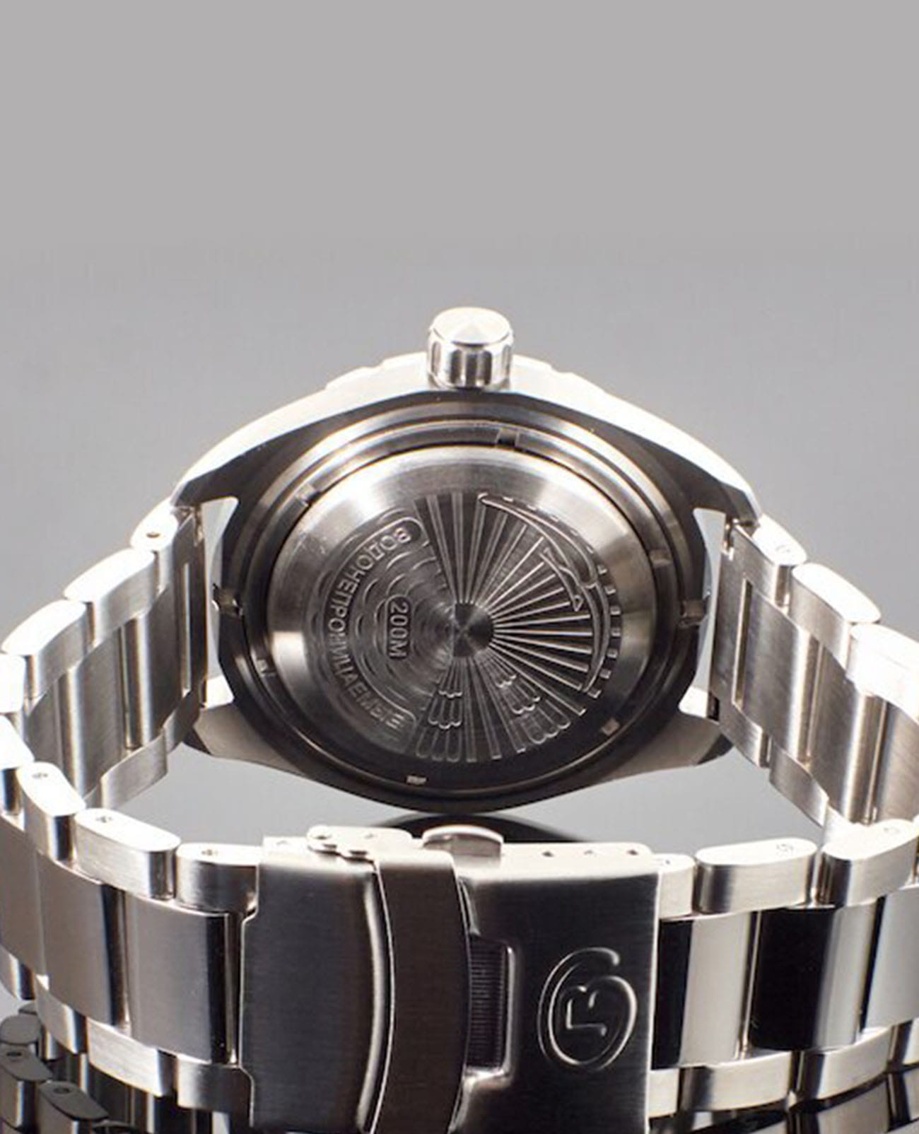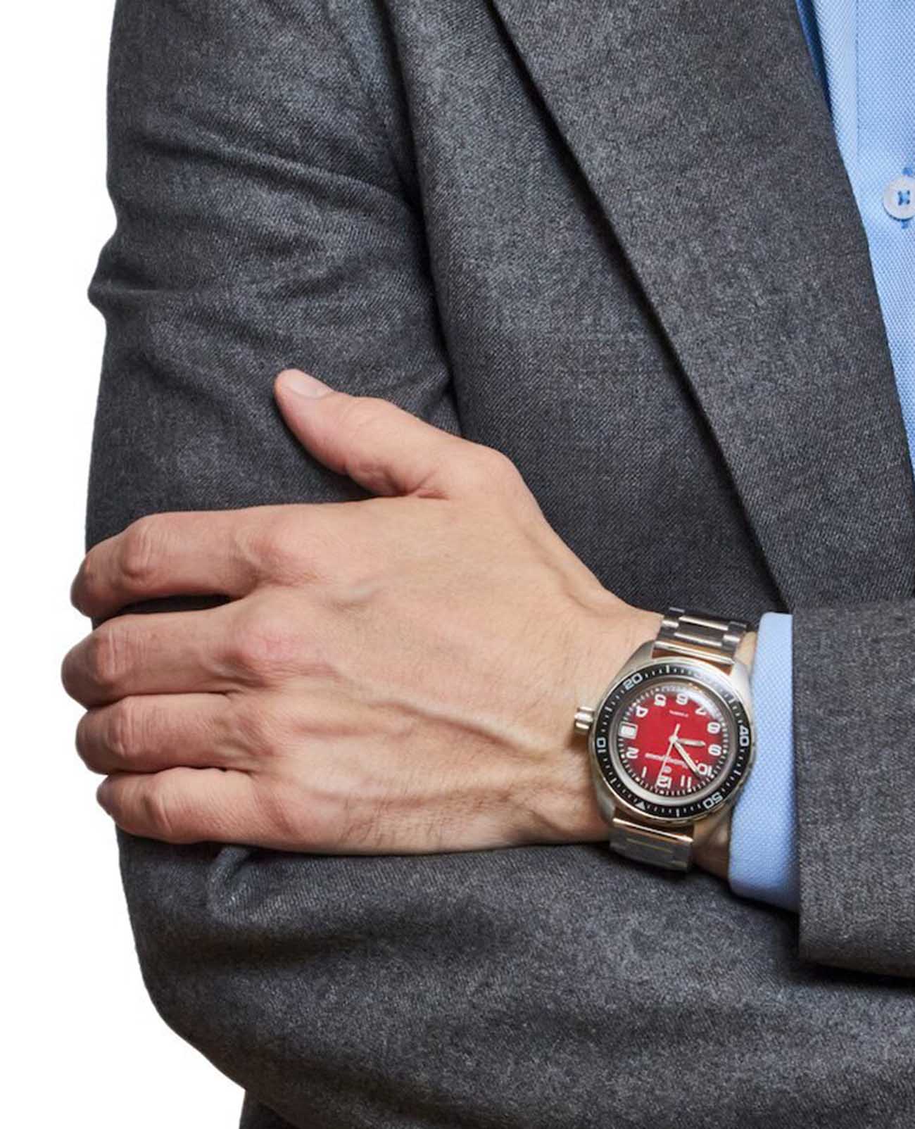 Мужские российские механические наручные часы Восток Командирские 02035А, механический механизм (автоматический калибр) с высокой точностью. Класс водозащиты: 200 метров, позволит плавать, нырять и заниматься другими водными видами спорта. Стрелки с люминесцентным покрытиемЛюминесцентное покрытиеПозволяет считывать показания времени в темноте. Производители наносят на стрелки, часовые индексы, безель или поверхность циферблата светонакопительный состав, дающий холодное свечение.. Вращающийся безельБезельВнешний ободок, закрепляющий стекло. В спортивных часах так называется поворотное кольцо с делениями на циферблате, выполняет роль таймера – замеряет отрезки времени на шкале. Неподвижный безель – элемент декора. Однонаправленно вращающийся безель на дайверских часах позволяет фиксировать моменты погружения и выныривания на поверхность. из нержавеющей стали с PVDPVDУльтратонкое покрытие наносится в технике вакуумного напыления, сочетает в себе нитрид титана особой прочности со слоем золота или оксида хрома. Несёт в себе декоративную или защитную функцию. покрытием. Окошко даты находится в положении 3 часа. Автоподзавод с предохранительным устройством от перезаводки пружины. Частота: 19800 полуколебаний/час. Браслет с раскладной застёжкойРаскладная застёжкаТакой тип застёжки используется только на браслетах из металла. Она никогда не раскрывается полностью, происходит разделение на 2 и более частей. Раскладывающая застёжка снизит вероятность потери часов к минимуму..